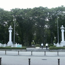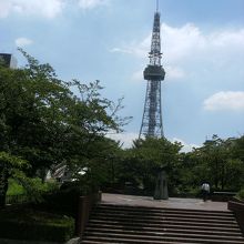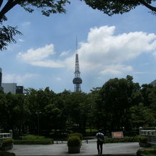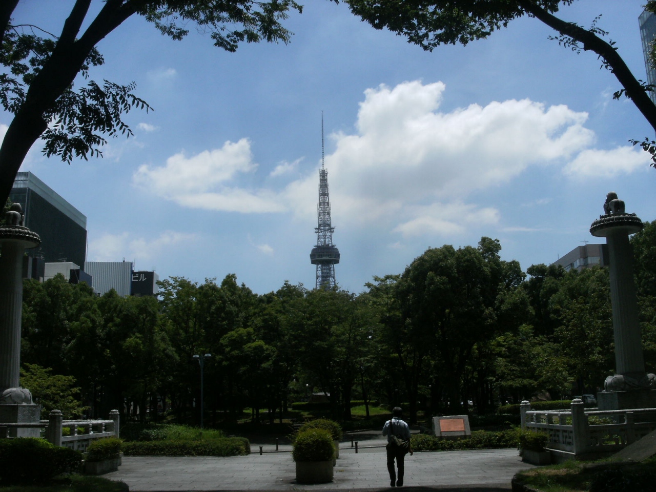 細長く続く木々に囲まれた公園で 途中でいくつかの通りを渡る事になりますがちょっとした散策路のような感じになってい て 名古屋テレビ塔もこの公園内に立っています。テレビ塔にだんだんと近づいていくと 木々の上に塔が見えてくる様子もちょっとした期待が感じられます。