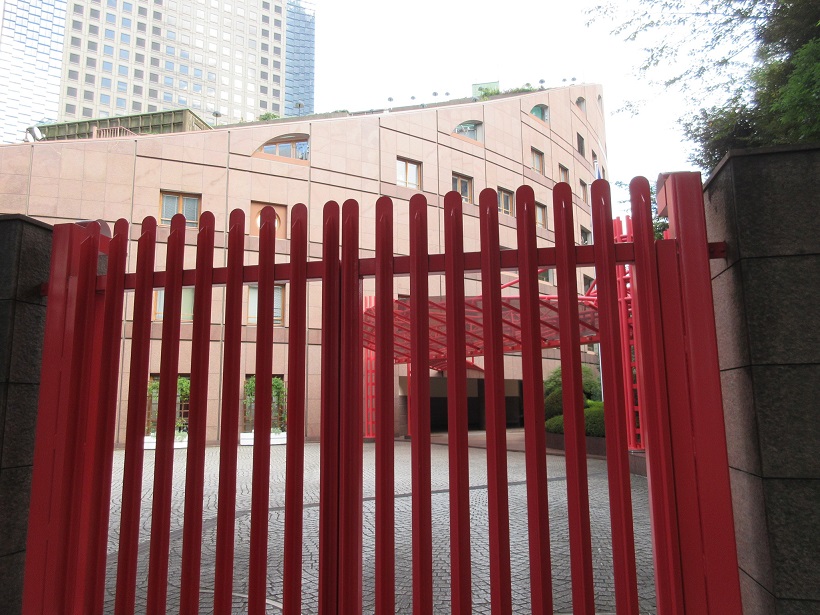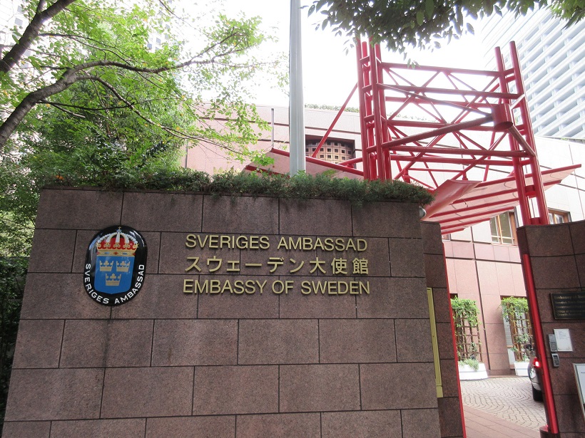 泉ガーデンヒルズの裏手、丁度スペイン大使館の向かいにある大使館です。遠目でも、赤茶色を基調にした「現代アート美術館」のような外観で非常に目立ちます。色だけではなく建物の形状も曲線を多用し、北欧ってアートの国なんだと感じさせられました。