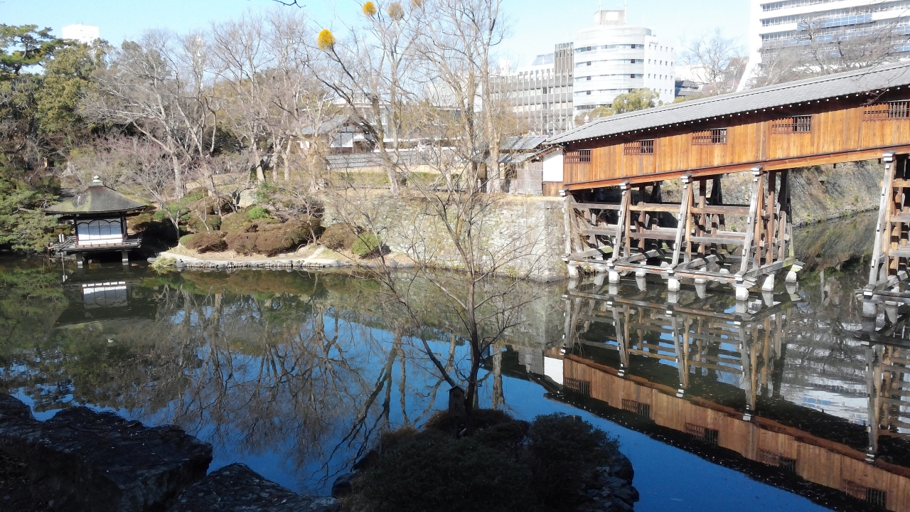 庭の中で最も特別なのは、伝統的な床構造で歩くことができる傾斜木製の橋です。 冬には紅葉はありませんが、小さな庭の近くにまだ緑の葉の半分があります。落ち着いた水と自然の良い反射の景色を見るのが嬉しいです。