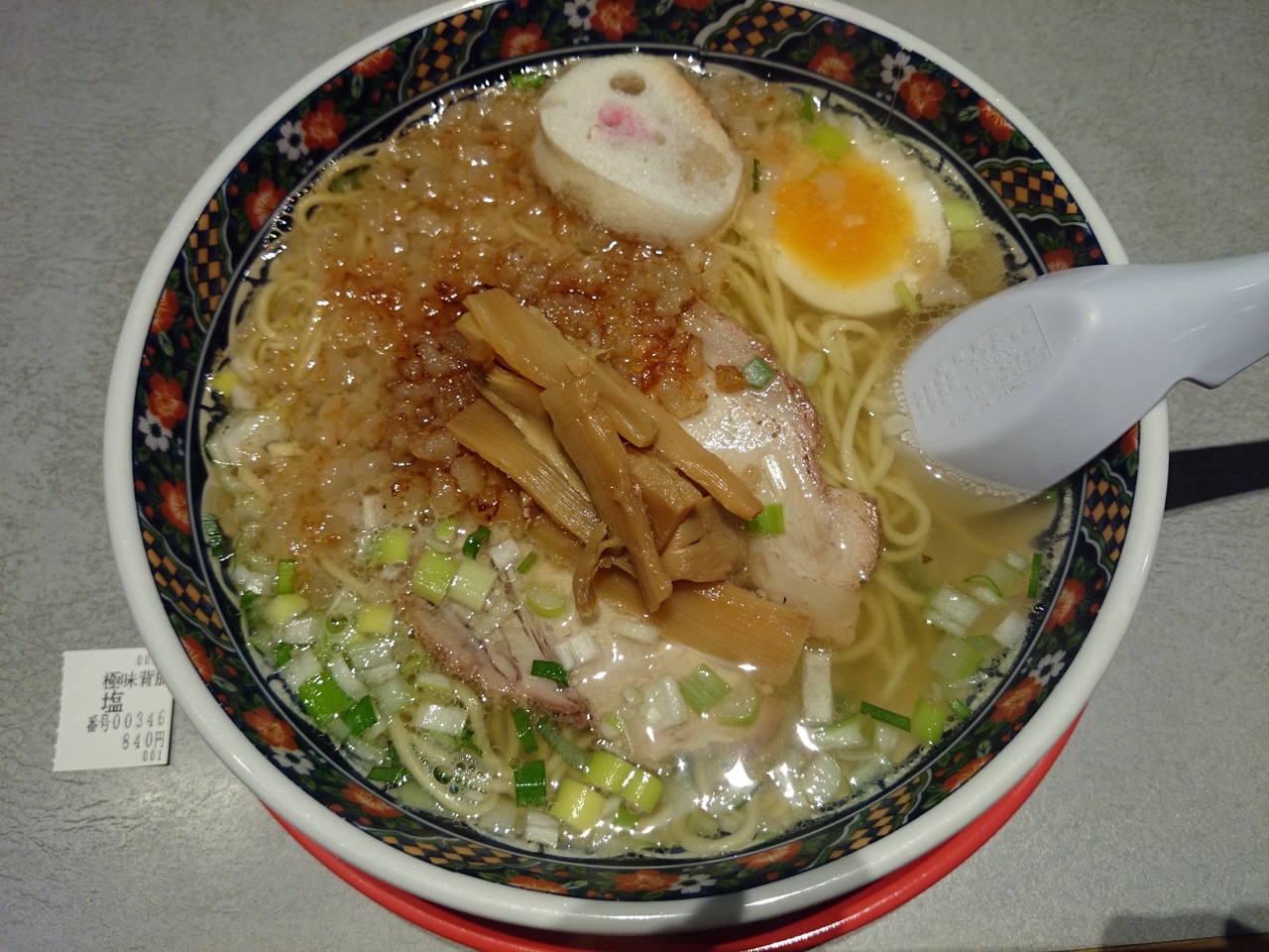 定番メニューは塩ラーメンですが、自分は塩ベースの背油ラーメンを注文しました。