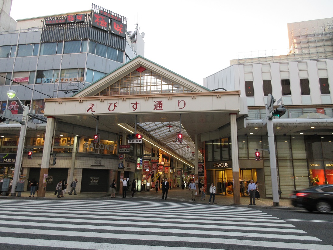 山田電機Labiやフクヤの裏手を東西に走る商店街です。本町通り商店街に比べると人通りもすくなく、すこし活気に乏しいように感じました。古い昭和の雰囲気を色濃く残しており、地名の由来となった恵比寿神社が山田電機Labi,三越の裏手にあたる場合にのこっていました。