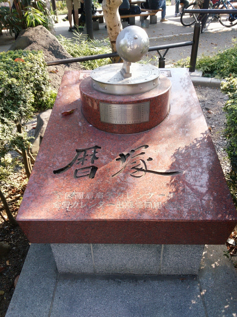 上野恩賜公園内の不忍池の真ん中ほどに弁天島がありますが、弁天島にある弁天堂を囲むようにたくさんの記念碑や塚などがありました。そのひとつに暦塚はありました。全国カレンダー出版協同組合連合会などが建立したものです。日時計と地球儀をモチーフにしたもので他の石碑などとはデザインが異なり見応えもありました。