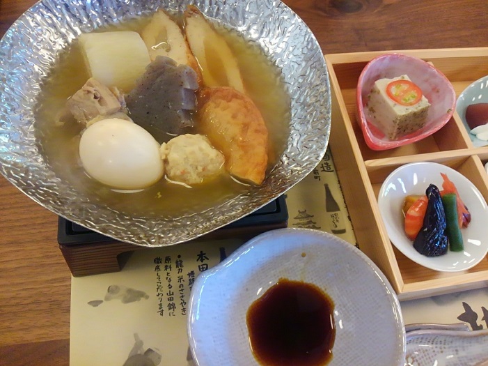 ヤマサ蒲鉾の夢鮮館の帰りに立ち寄りました。店名は”そば”ですが、姫路おでん付きの定食が有名だそうなので、そちらを戴きました。姫路おでんは生姜醤油を付けて食べるのですが、思っていたよりもしっかり味の付いた普通のおでんだったので、生姜醤油を付けずにそのまま食べました。正直なところ、おでんよりも他のおかずの方が美味しかったです。建物自体がとてもきれいで、バリアフリーもきちんとしています。売店がとても広くて、姫路のお菓子などつい沢山買ってしまいました。