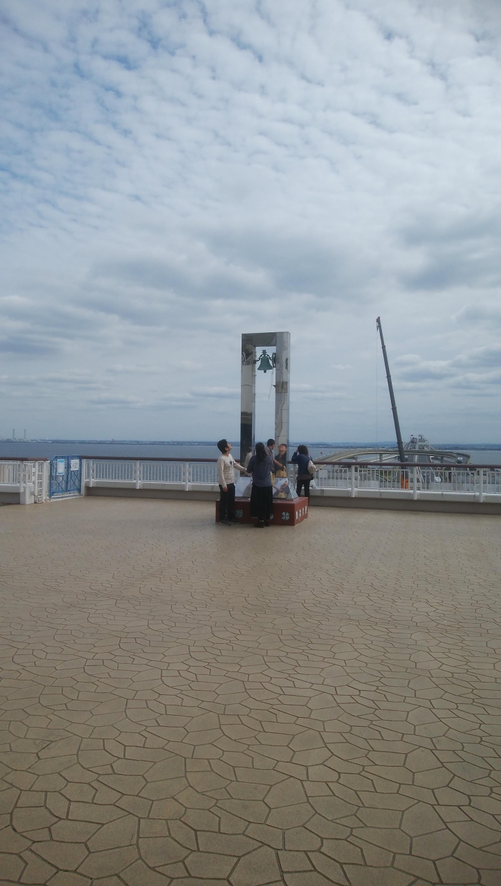 仕事の移動で木更津方面から東京都内に向かう際に海ほたるに立ち寄り、その際に館内をぶらぶらした際にこちらを再訪しました。立ち寄ったのが平日のお昼に近い午前中だったので、天気はまずまずでしたが、2組だけしかこの鐘の周りにはいませんでした。平日はまったりとして穴場かもしれません。鐘の向こうに見えるアクアラインは一直線で何となく風景になっています。その向こうの千葉側の景色は、昼間の景色は微妙です。特に変わり映えする景色ではないです。