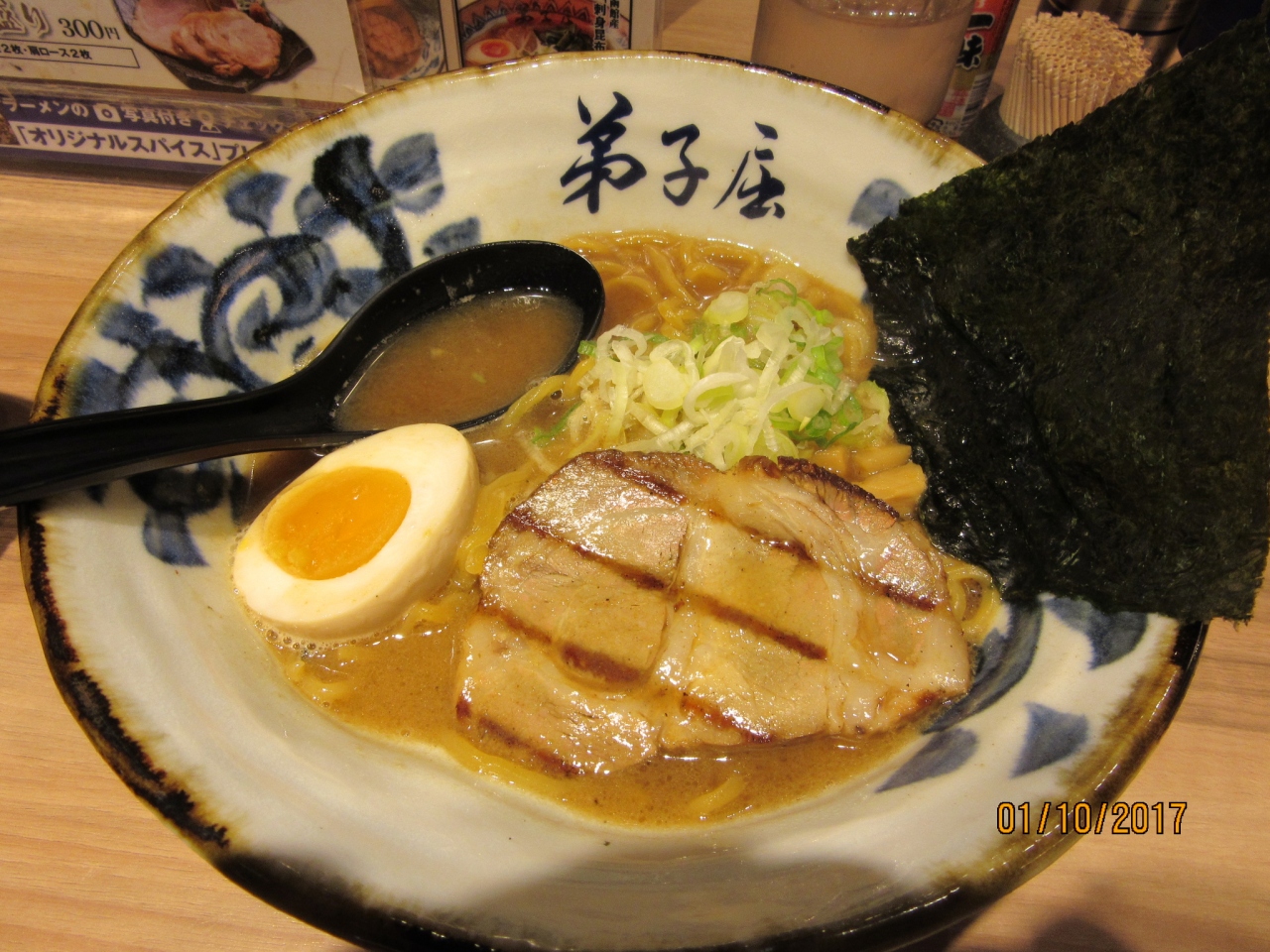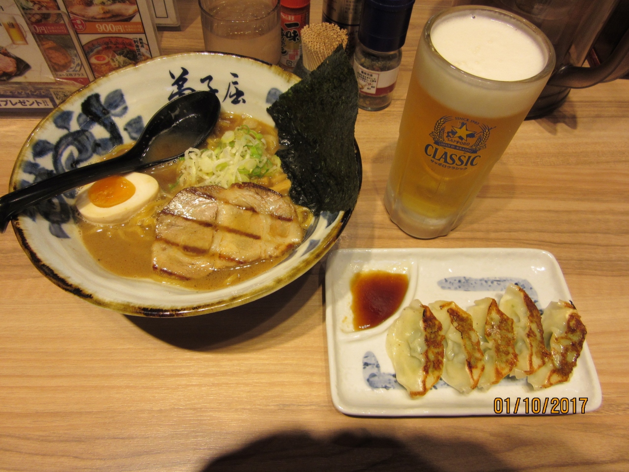 新千歳空港で航空機の待ち時間に入店。空港3階のラーメン道場内の店で全部で10店舗の内で二番目に行列が出来ていた店。一番人気は【一幻】という店で長蛇だったので、それよりは少ない列のこの店に入った。一押しという【魚貝しぼりしょう油ラーメン800円】を注文。プラスしてビール・餃子セット650円も注文し合計で1,450円。