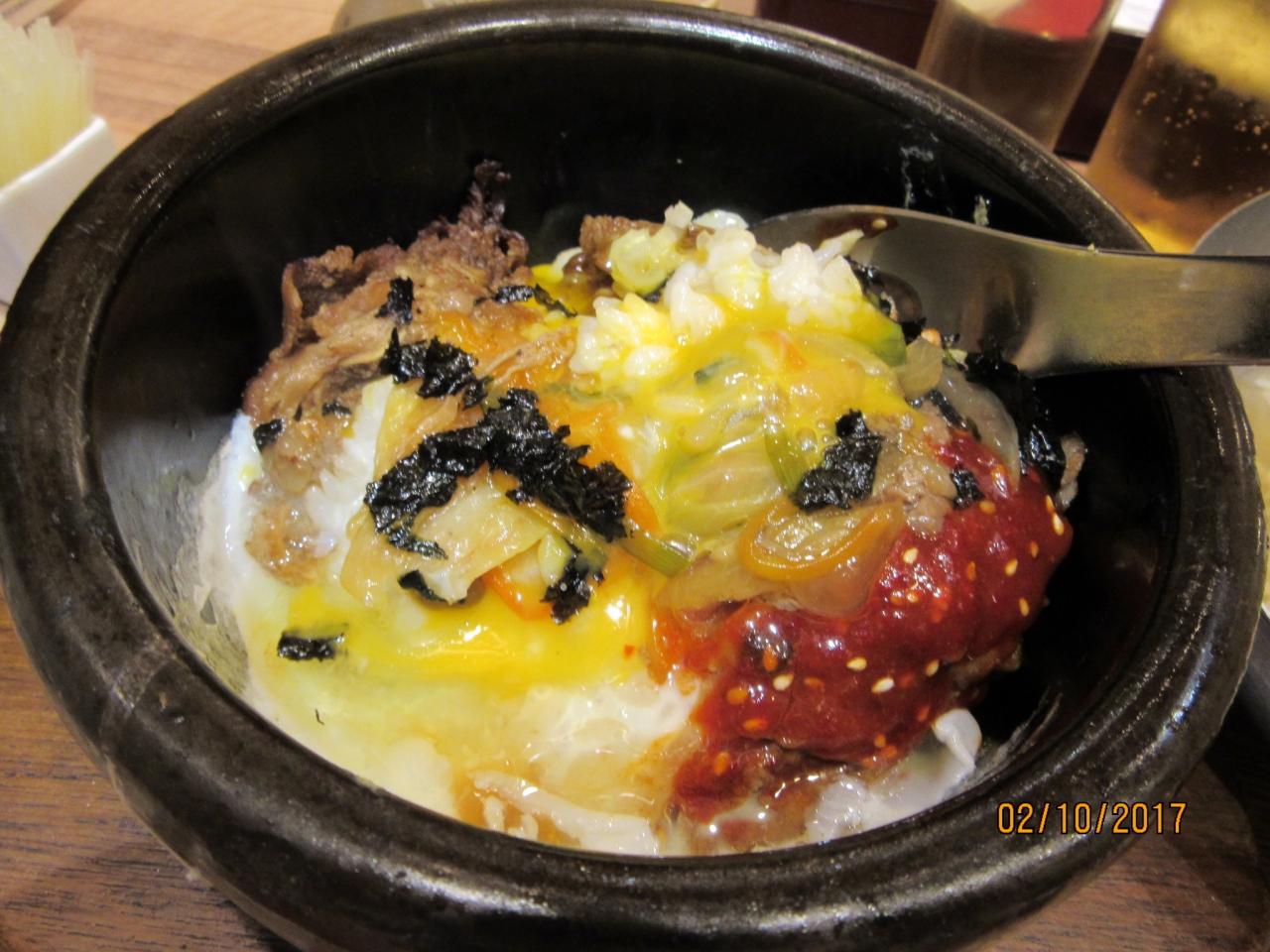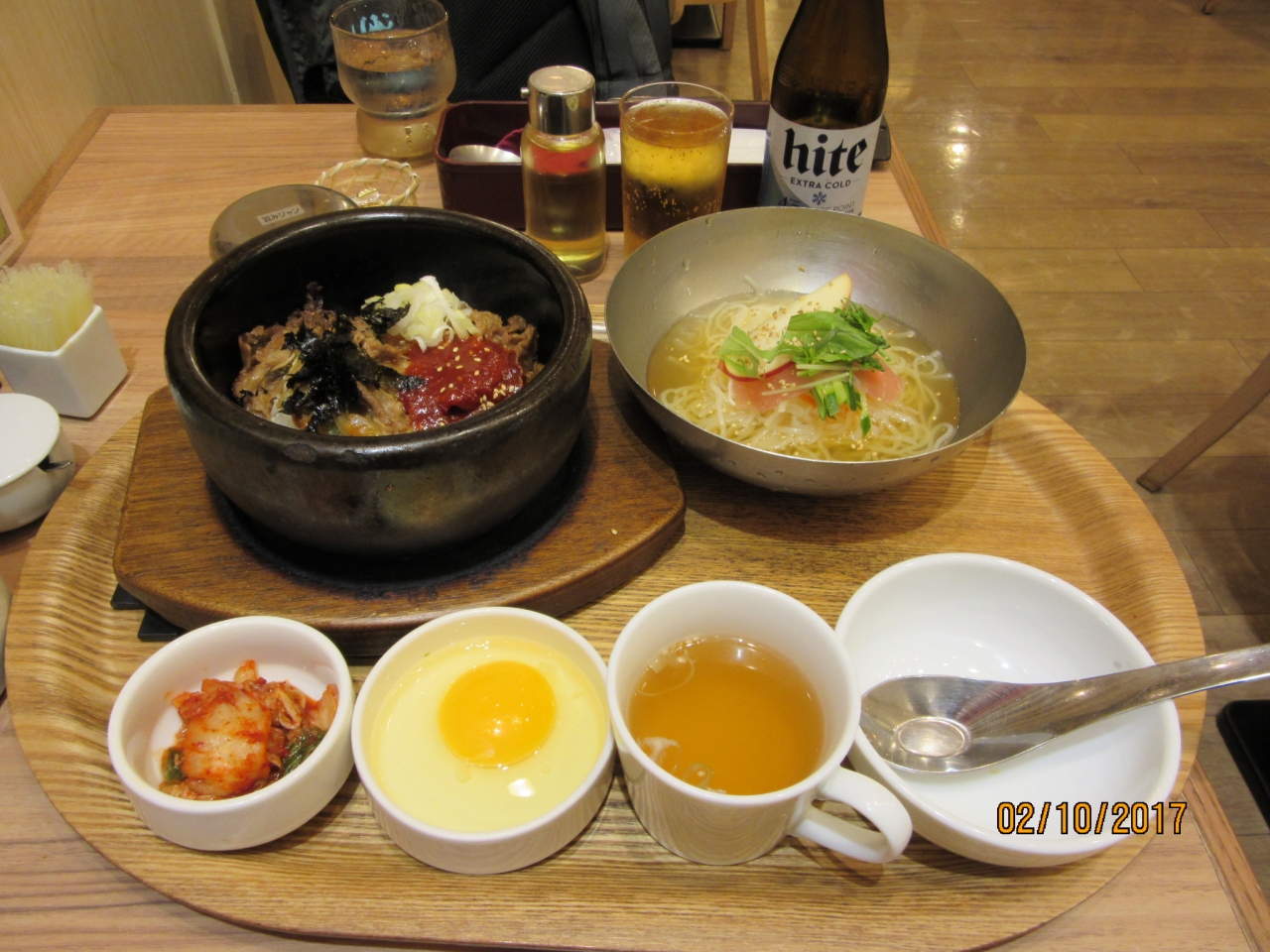 札幌駅近のステラビルの6階レストラン街の店。昼時店を探したが、回転ずしの店等の人気店は待っている客が多く、この店はすんなり入れそうだったので選んだ。韓国料理の店で954円~1,278円(税抜き)でランチ数種類あった。石焼きビビンバとミニ冷麺セット1,195円と韓国ビールHite500円=1,695円+税=1,830円。