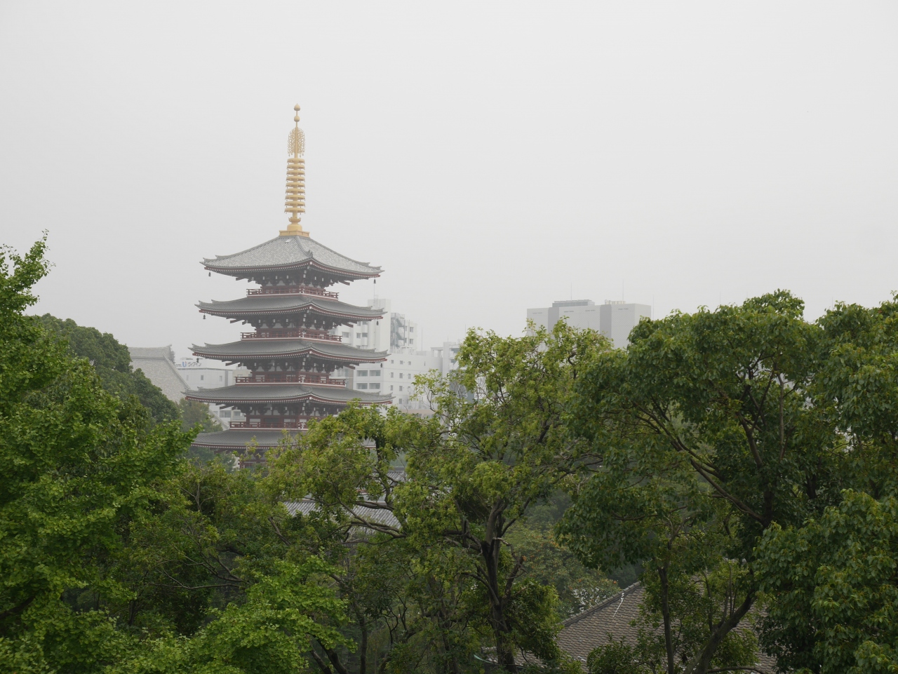 ホッピー通りに面したホテルに宿泊したところ、朝起きると、朝もやに霞む幻想的な五重塔が見えました。