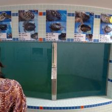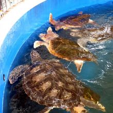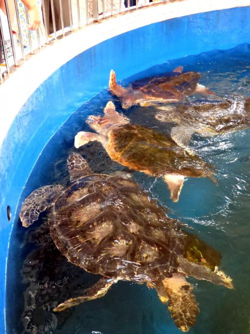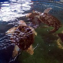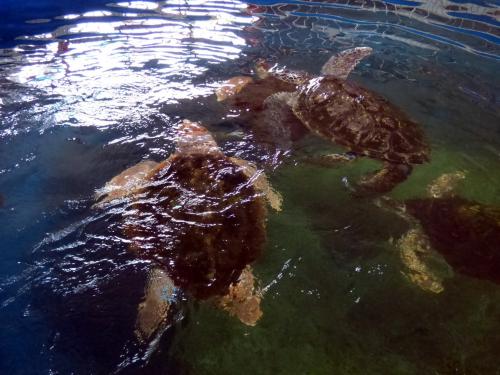 メインの海亀プールでは大きな海ガメがたくさん泳いでいて、エサやりもできます。