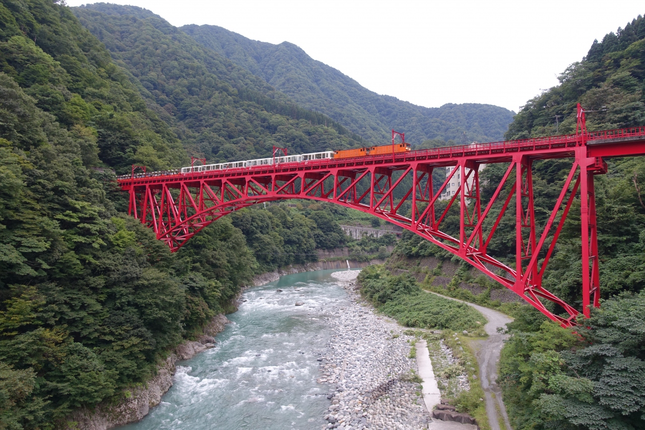 宇奈月温泉の駅から歩いて5分ほどのアクセスのよいところですが、黒部峡谷一番の絶景がこの山彦橋とその背景の山です。トロッコが走る新山彦橋と、今は遊歩道になっている旧山彦橋。トロッコからの眺めも、遊歩道からの眺めも、どちらもみごとです。