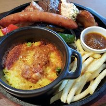 メニューはお肉中心、今回はお肉とピラフのセット、サラダ(大盛)とドリンク・デザートまでついて2000円でした。