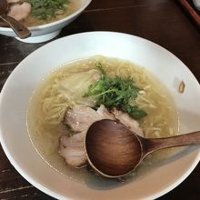 塩ラーメンの名店で上品な鶏ガラ使った透明な塩スープにもっちりとした多加水の平打ち麺がぴったりです。