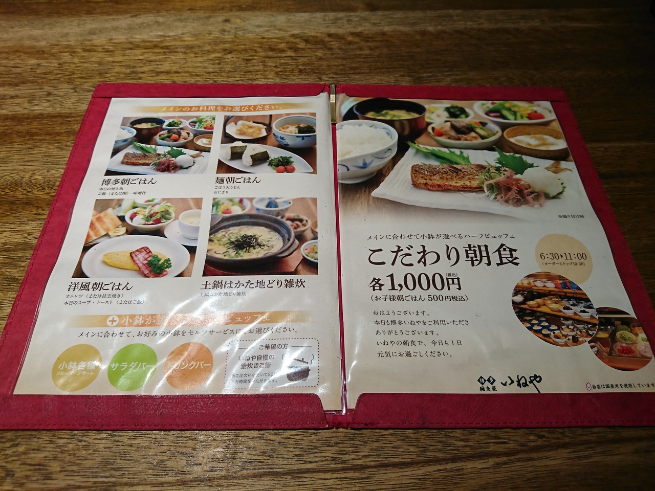 メインの朝食を1品選び、小鉢、サラダ、ドリンクはブッフェ形式となっていました。