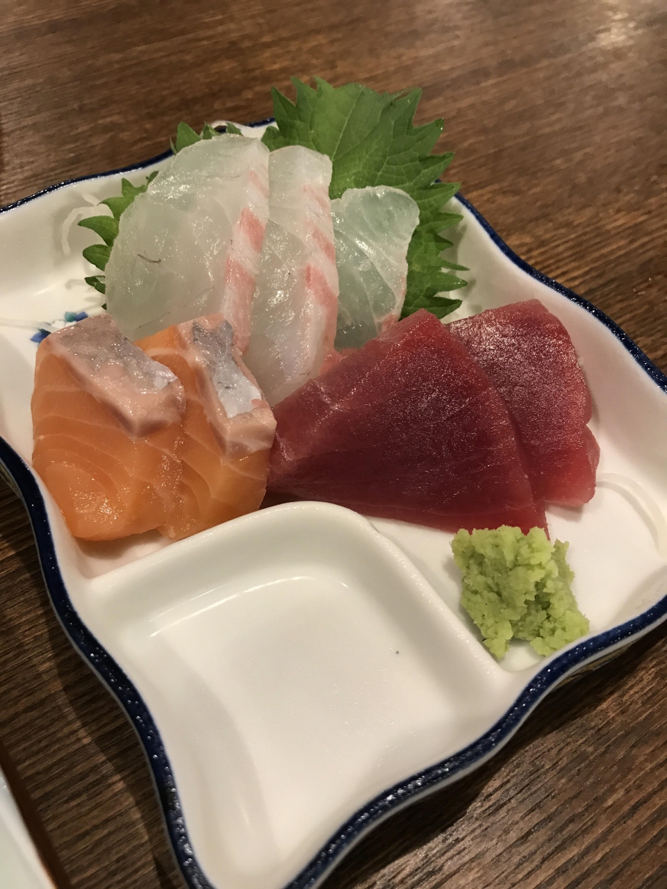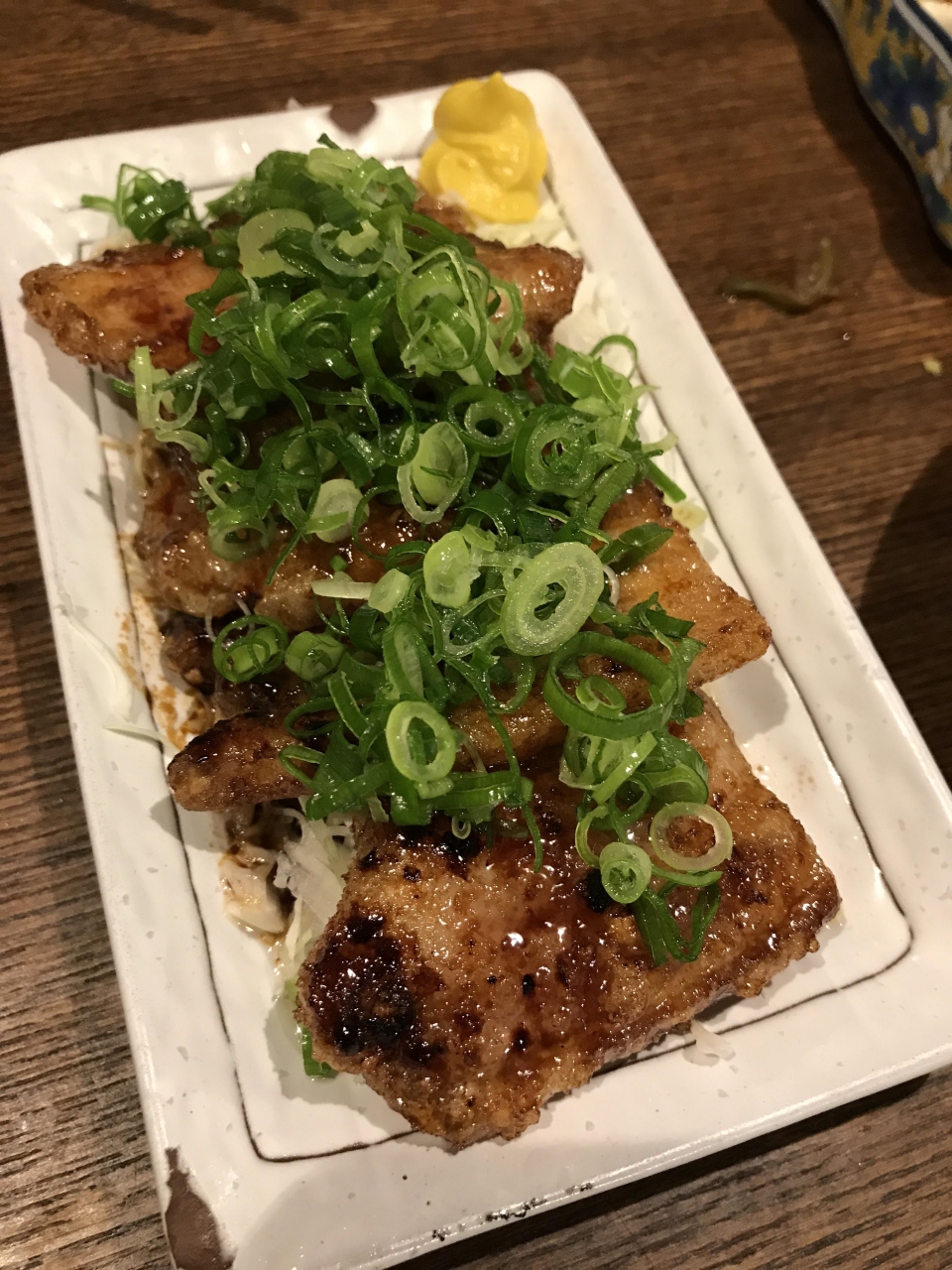 切り干し大根、ウナギ肝串、刺身三種盛りなんかをオーダーし、ビールで喉を潤します。ほどなくしてもう一人が合流したので、もつ煮、豚バラ蒲焼?などを追加。酒は日本酒へと移行していきます。