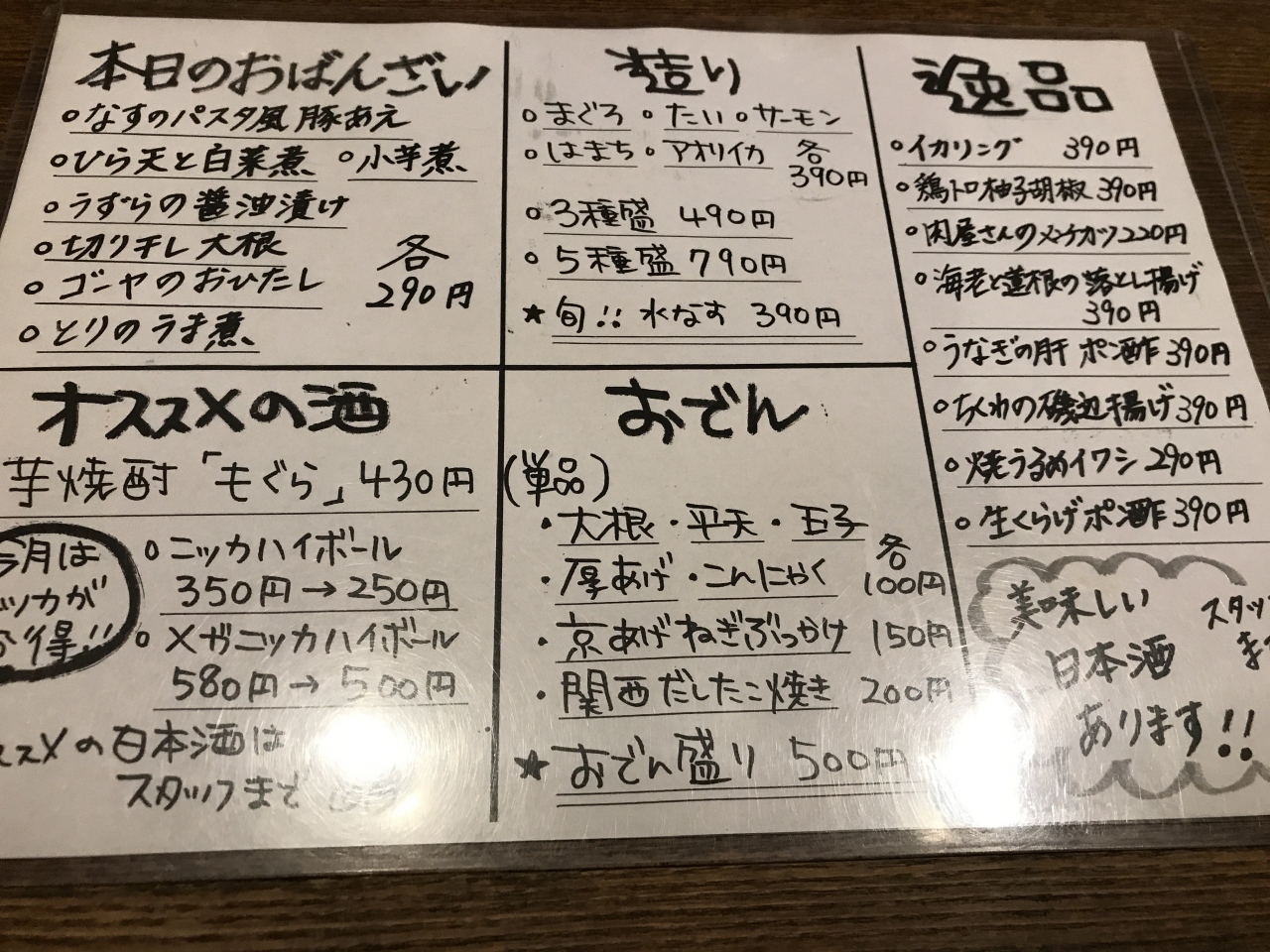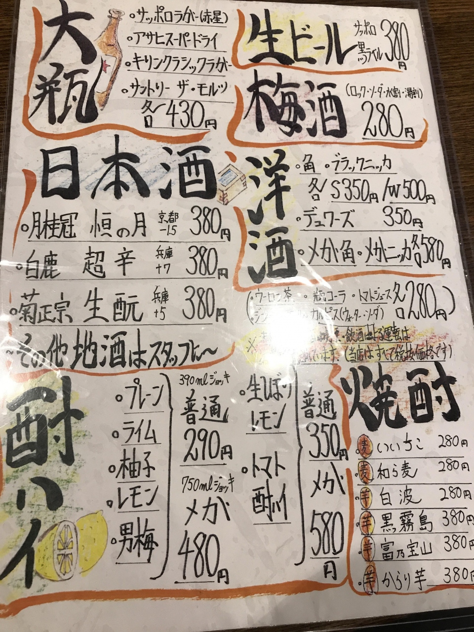 プロムナード歩くと二階の立ち飲みスペースが見えますが、いつもいっぱい。この日は台風接近のおかげか一階のカウンターに空きがあり上司と2人で入りました。