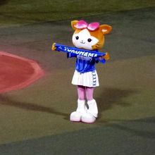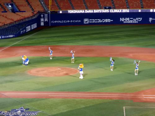 プレーボール前には試合開始を盛り上げるDB.スターマンとDB.キララ、そしてお臍を出して寒げなコスチュームのチアガールが舞います。