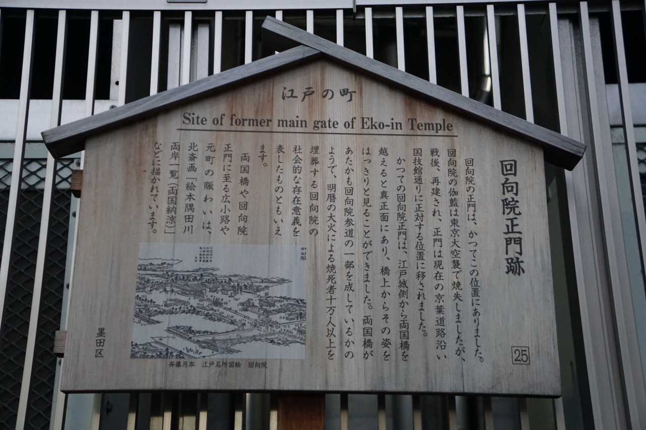 回向院の正門跡という説明板が妙なところにありました。それに正門跡ってそんなに大事なことなのかと思ったのですが、説明を読んで納得。