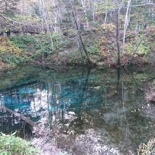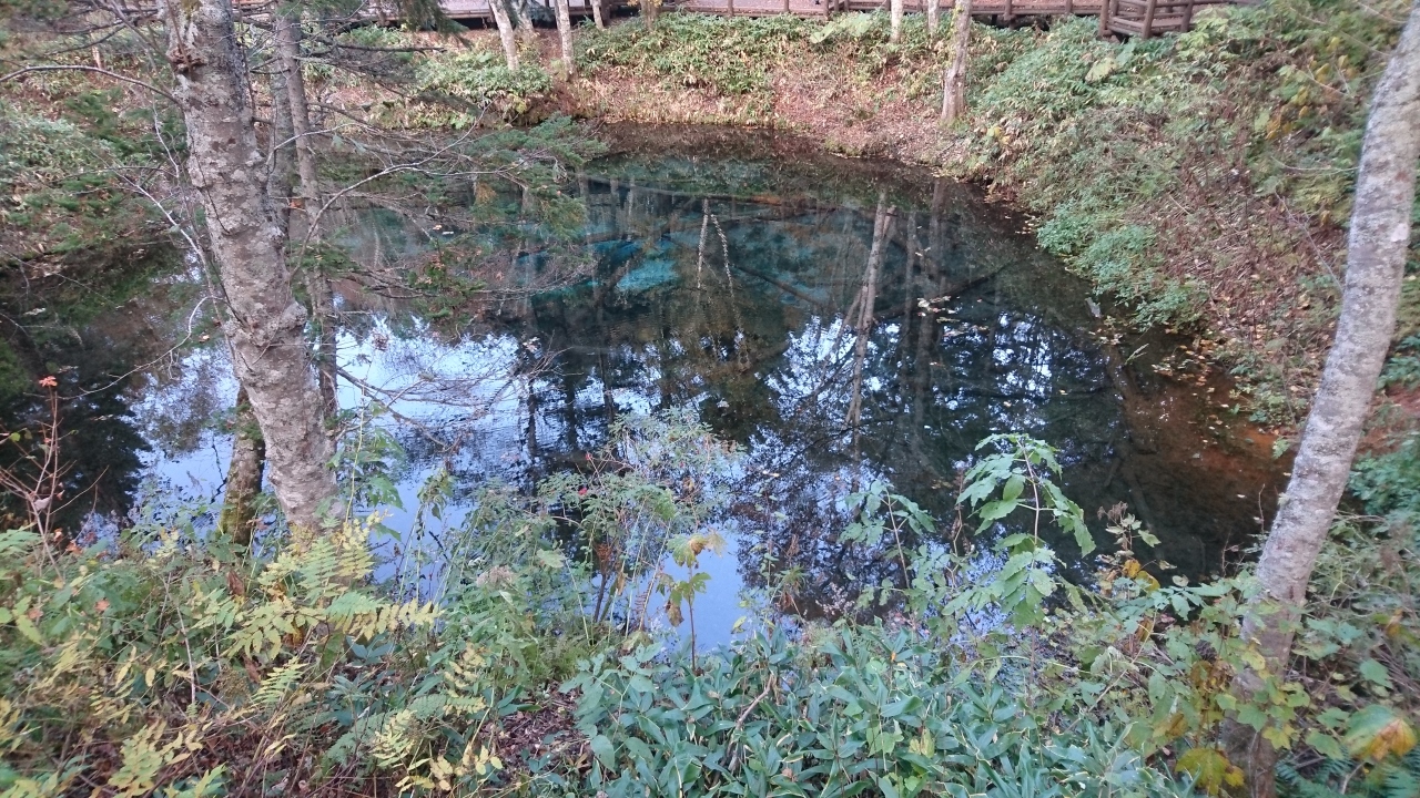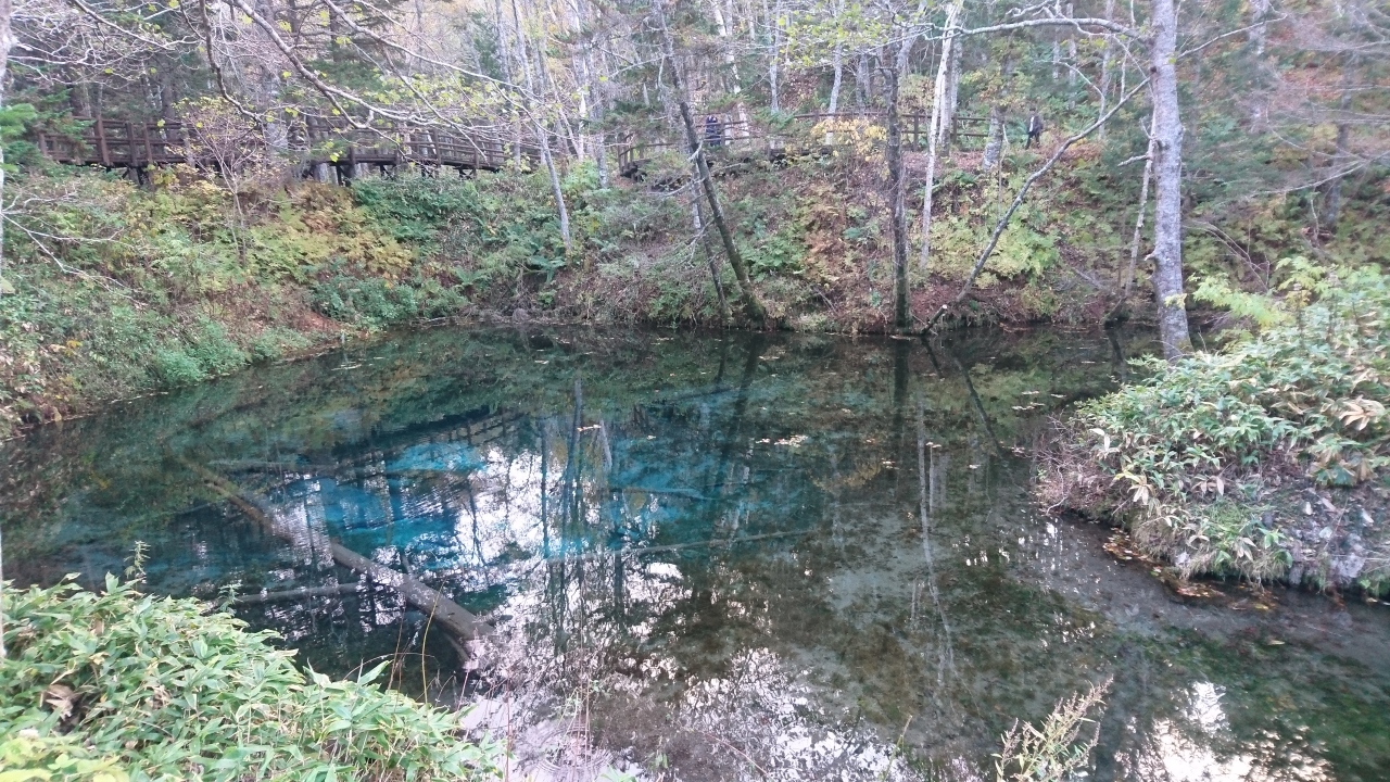 16時前に訪れた。パーキングは広め。池の周りは遊歩道が出来ていて1周歩けた。時間帯にもよるのか青かったのは一部のみ。しかし水は澄んでいて沈んでいる木がはっきりと見えるほど。紅葉もしていた。