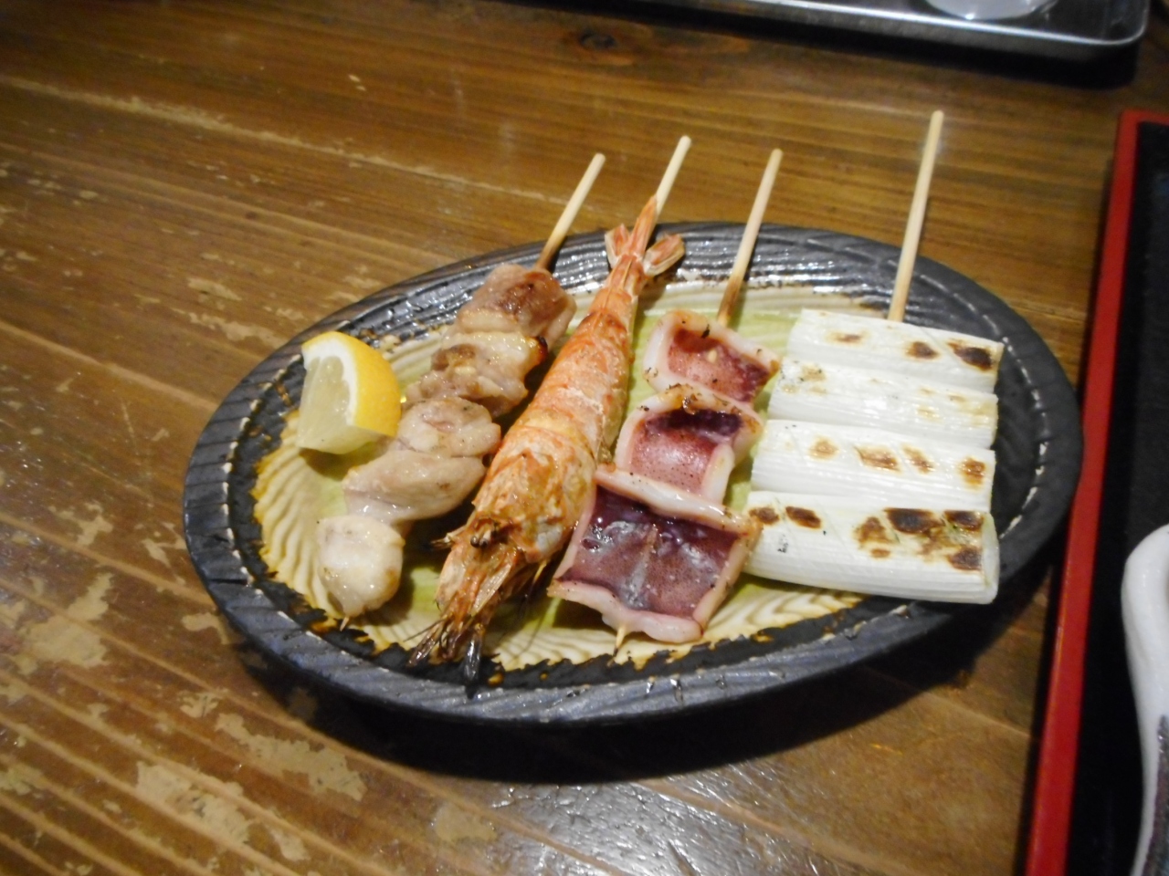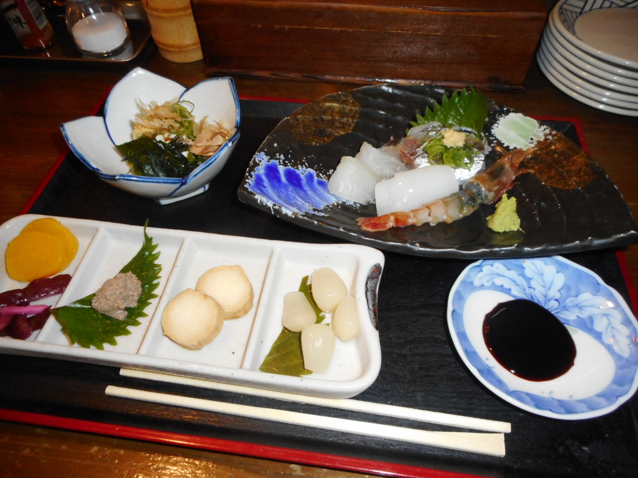 カウンター席とテーブル席の小さい店で、うれしいことに山陰のうまいもんが少しづつ入ったセットが1480円であり、これだけで刺身から焼き物までひととおりの名物が入っている。今は秋のモサエビシーズンで、刺身はモサエビ、イカ、アジの3点、つまみにカニ味噌、長芋、らっきょう、焼き物にモサエビ、イカなど。