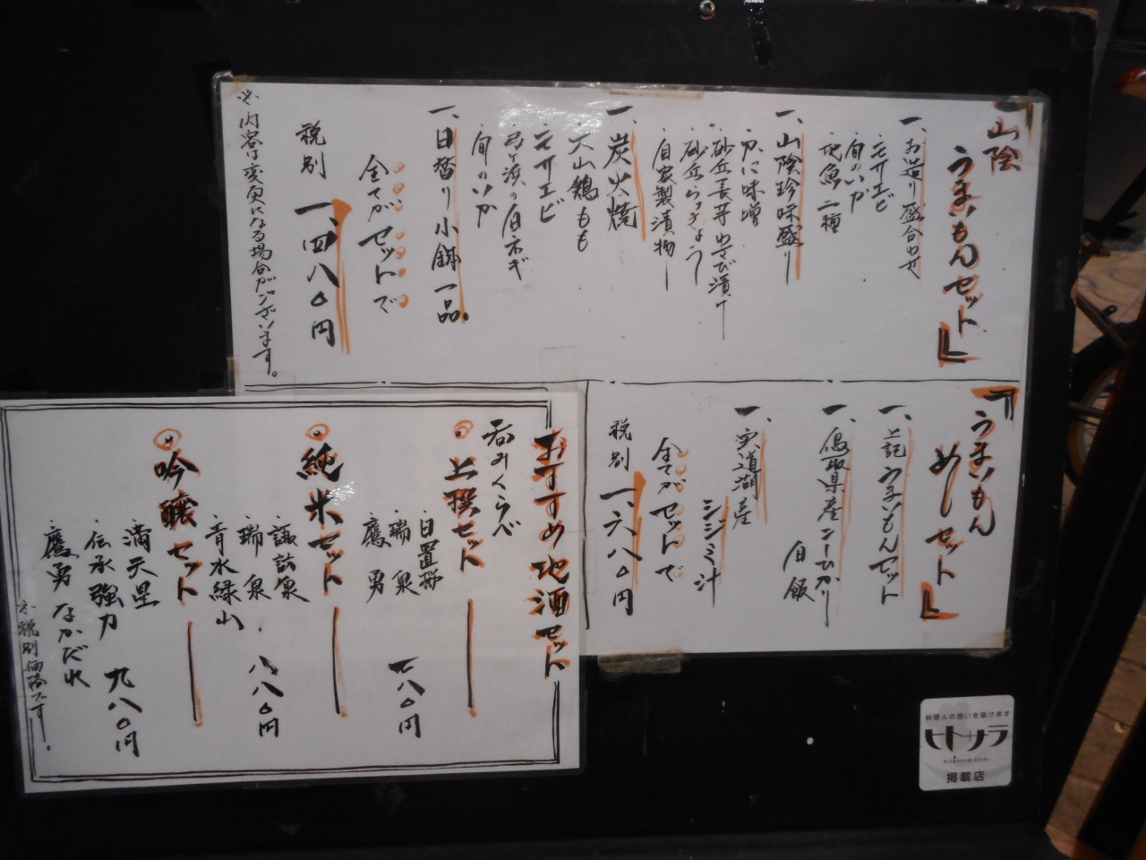 地酒もお手軽値段である。もちろん他に一品料理も充実で、山陰の美味が一人で楽しめる。