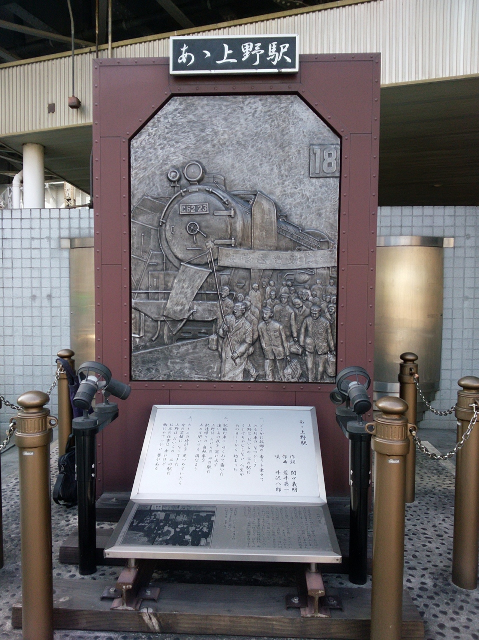 上野駅(広小路口)を出たところに記念碑はありました。解説によると、昭和30年代~40年代にかけて地方から就職列車に乗って上野駅に降り立った集団就職者(若者)を応援するための歌の記念碑でした。現在の豊かな日本があるのも彼らのおかげであることを改めて認識させられる記念碑でした。