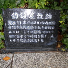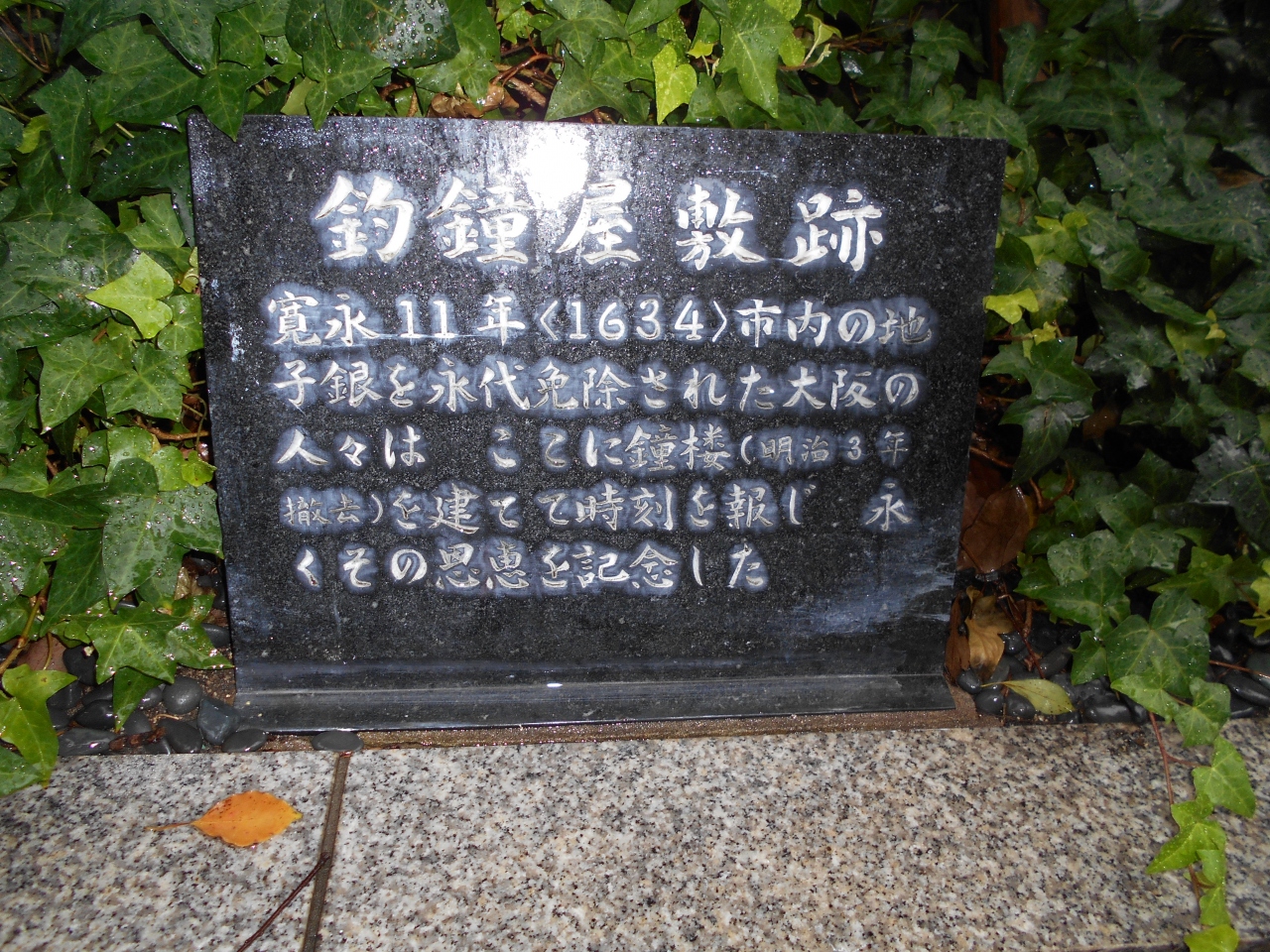 1634年、三代将軍徳川家光が大阪城へ来た時、大阪の町中の地子銀(固定資産税のようなもの)を永久に免除することを約束したことに感謝し、釣鐘が作られたそうです。碑が釣鐘町のマンションの植え込みにありました。