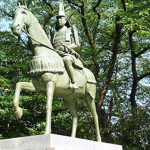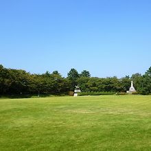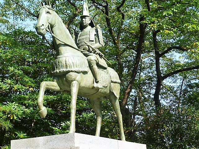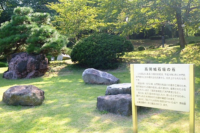 高岡駅から路線バスで`高岡大仏`を参拝して、徒歩で[高岡古城公園]に来ました。登坂を歩くと市民体育館/射水神社が見えてきます。やはり本丸跡が?…広々とした芝生公園で周りは前田利長公像や芸術像が囲んでいました。`高岡城石垣の石`が城跡を物語っていますね!