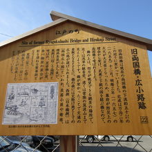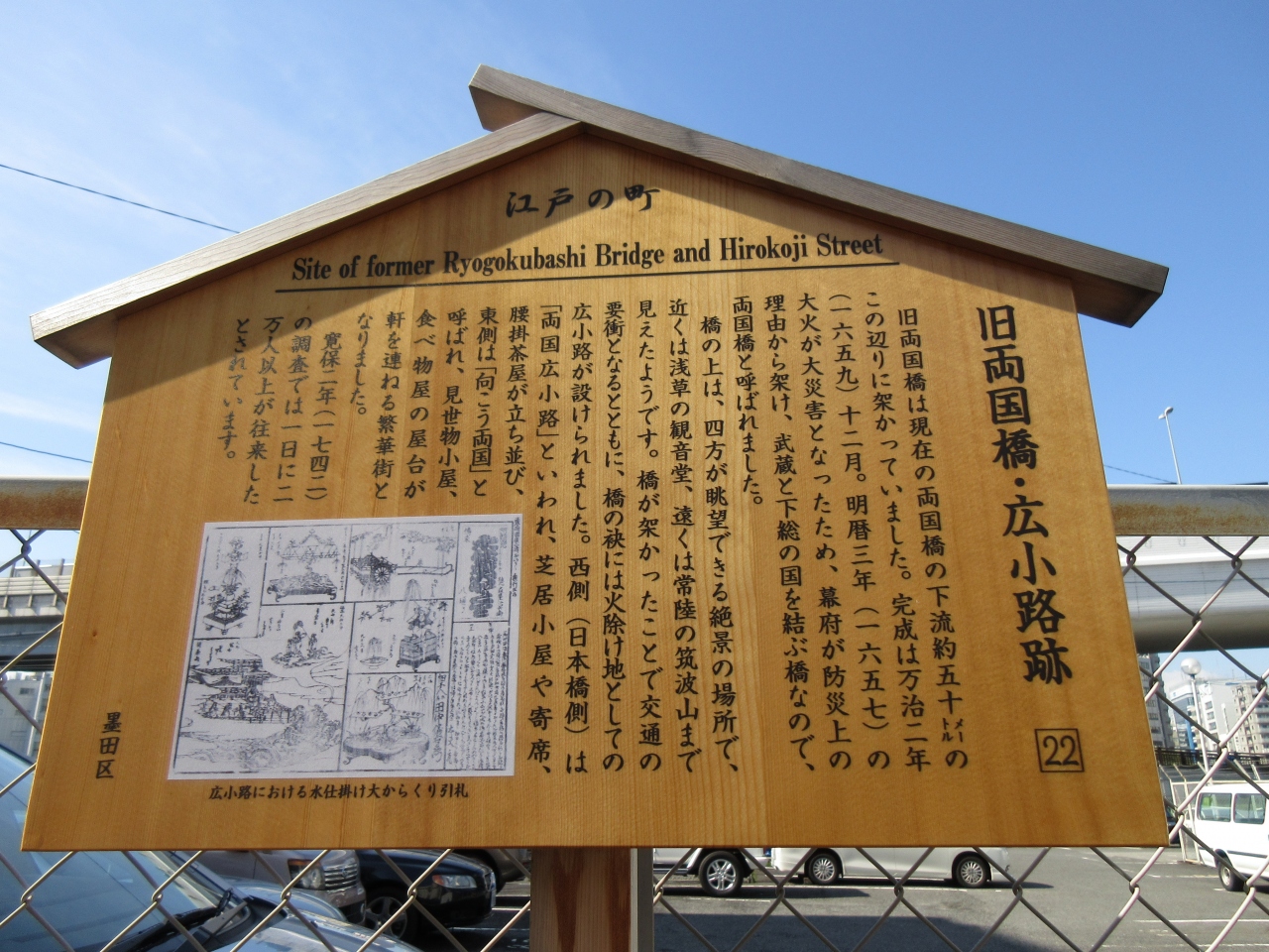 両国橋のたもとに立つ表忠碑から、裏通りを1分ほどのところにある駐車場のフェンスに説明板が掲げられています。明暦の大火で多くの方が無くなったことから、両国橋が掛けられ、その周囲に火除け地として広小路が設けられました。その結果、芝居小屋や茶店が並び繁華街になったとのことです。今はその面影もなくビルが建ち並んでいます。同じような内容が記されている碑が、両国橋を挟んでこの説明板と反対側のたもと近くに建っています。二つの説明を読むと、両国橋と広小路のことがより理解できるかと思います。