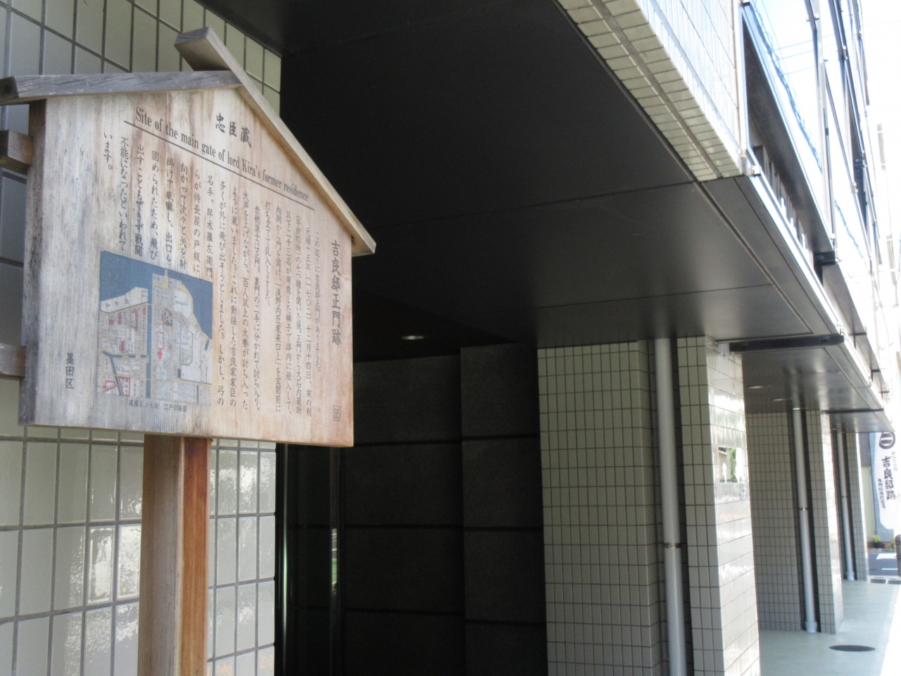 吉良邸跡が残る本所松坂町公園から1分ほどのところに説明板が立っています。赤穂浪士が討ち入った門があったところです。公園から正門跡と反対方向に2分ほど行ったところには、裏門跡に関する説明板が立っています。今残っている公園は当時の吉良邸の86分の1ほどです。2つの門跡の間を歩くといかに吉良邸が広かったかが分かります。