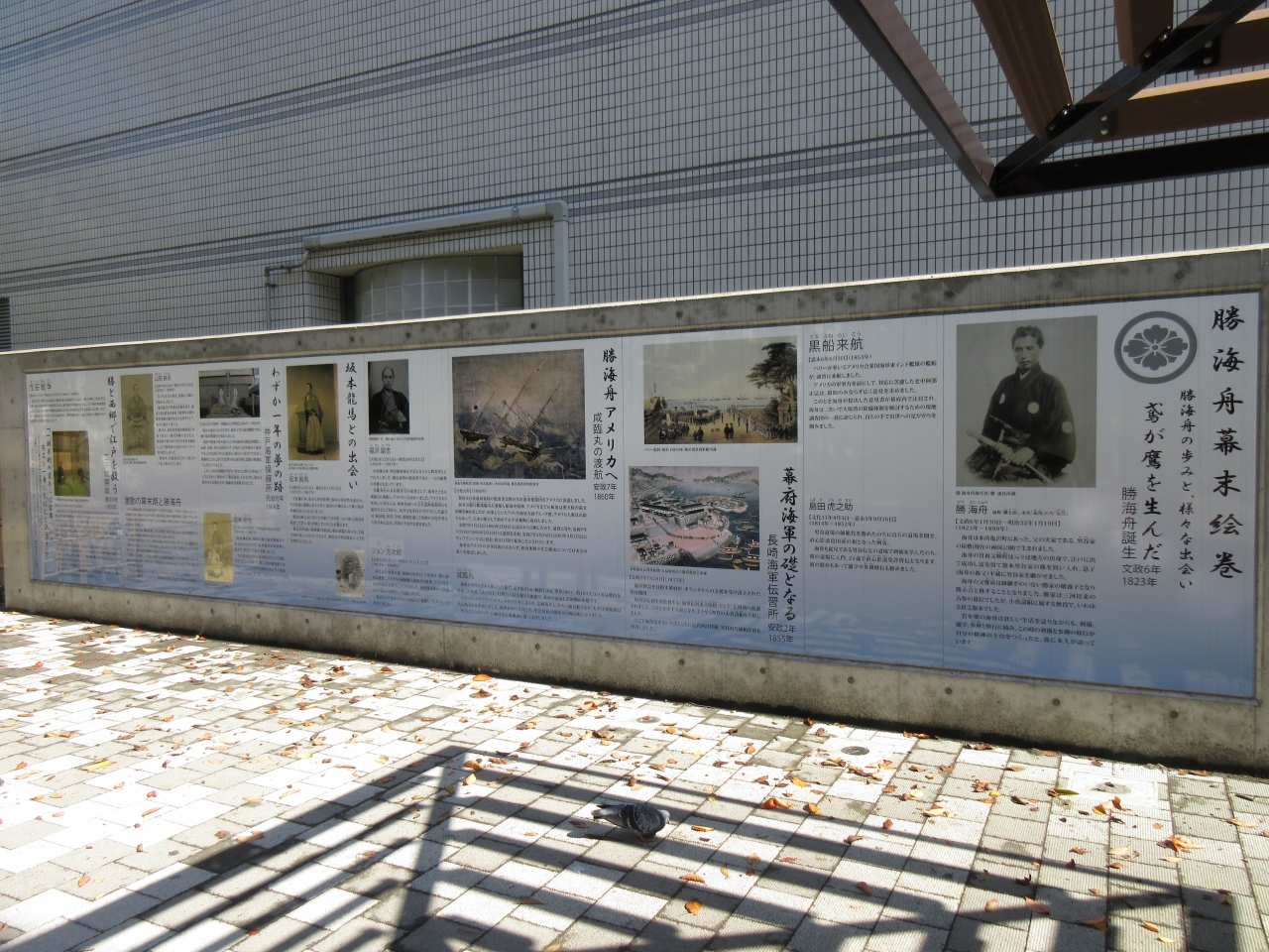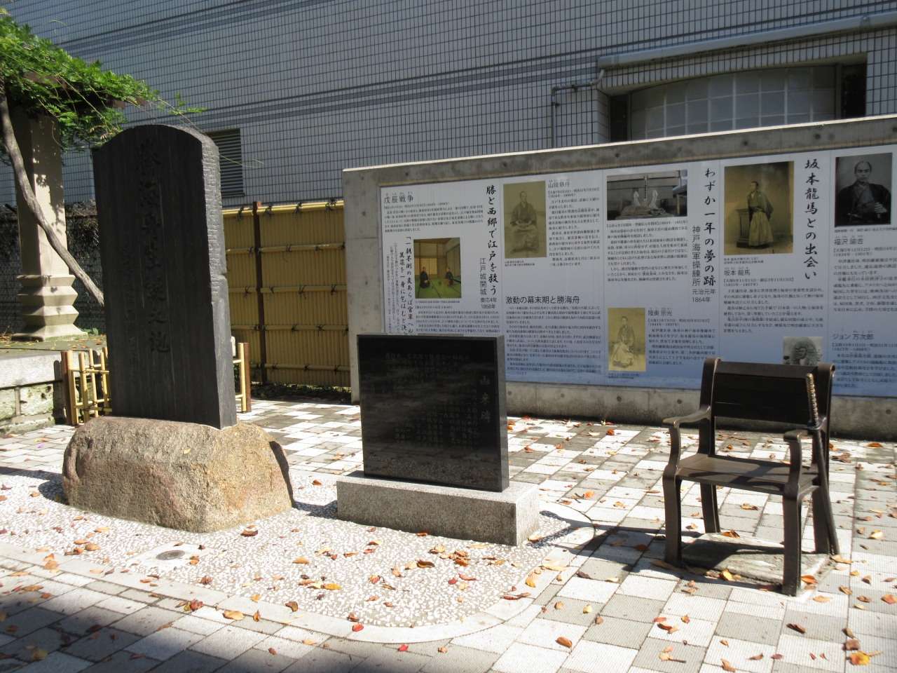 両国公園の中に碑が立っています。碑の後ろには勝海舟の歴史や功績、関わりがあった人物とのつながりなどが書かれた立派な説明板が展示されています。碑の隣には鉄製の椅子と刀が置かれていて、座って勝海舟気分に浸ることもできます。初めて訪れ、素晴らしい功績を残した人物に関する立派な碑と説明板だと思いましたが、公園で遊んでいる親子連れにはあまり関心を持たれていなかったのが残念に感じました。