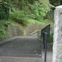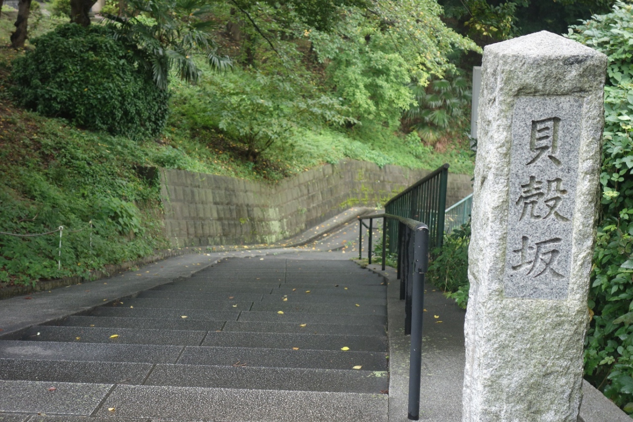 横浜の山手地区を散策中、元町公園と外国人墓地の教会辺りを下っていく坂を見つけました。ここが貝殻坂だそうで、木立に覆われた細い坂道を下りていくと元町公園プールの脇を抜けて元町の商店街の方へアクセスできるようになっていました。