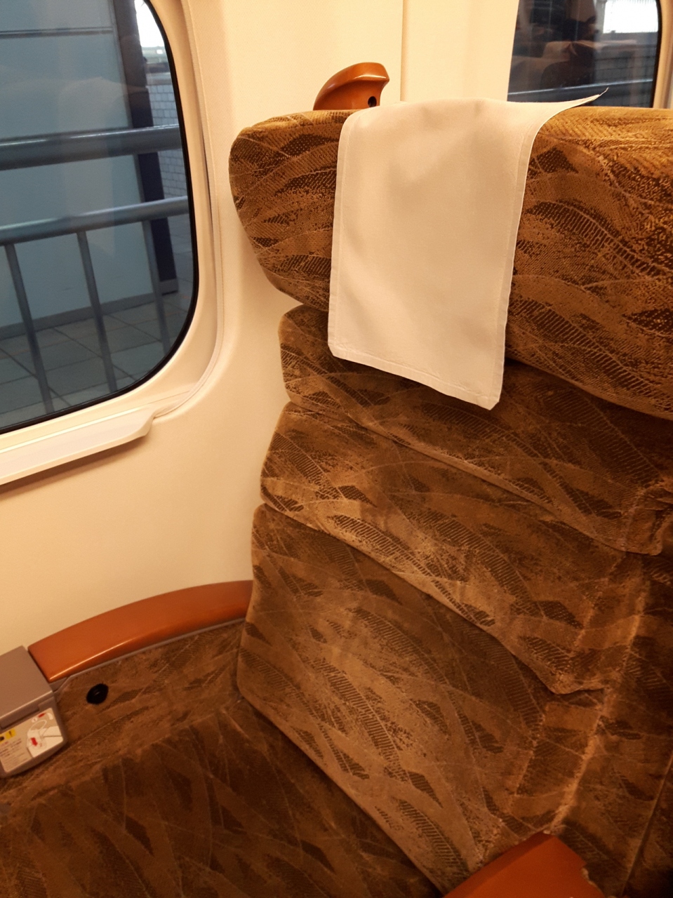博多から新幹線で新大阪へ向かう場合、本数は少ないものの、熊本、鹿児島始発九州新幹線のさくらも走っています。さくらの場合、2席x2席のゆったりした車内。大きなひじ掛けのついた椅子も広々としていて、ゆったり寛ぐことができておすすめです。