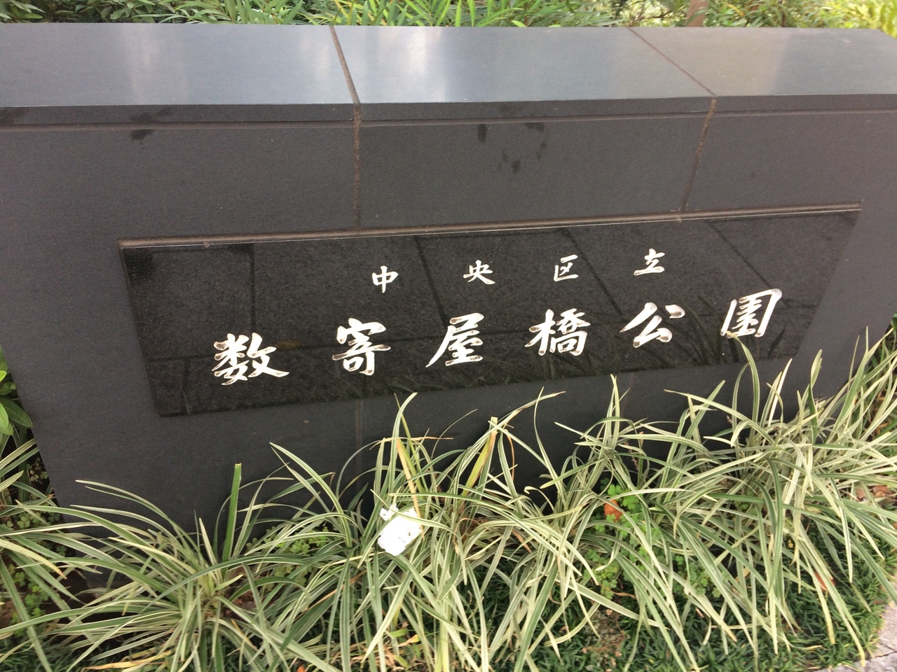 橋の下には江戸城の外濠がありましたが、1958年東京オリンピック前に埋め立てられて、首都高速とこの公園になりました。そんなに広くはありませんが、座って休んでいる人がいたり、カップルが談笑していました。
