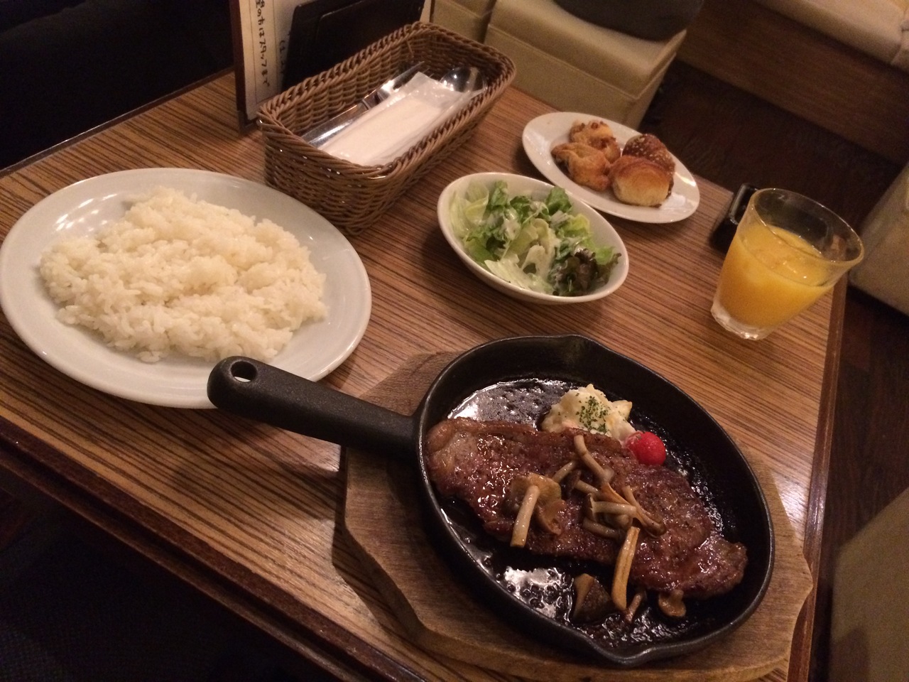 牛ステーキは1200円をちょっと超えるが平日はライスも付くのでこちらを注文。