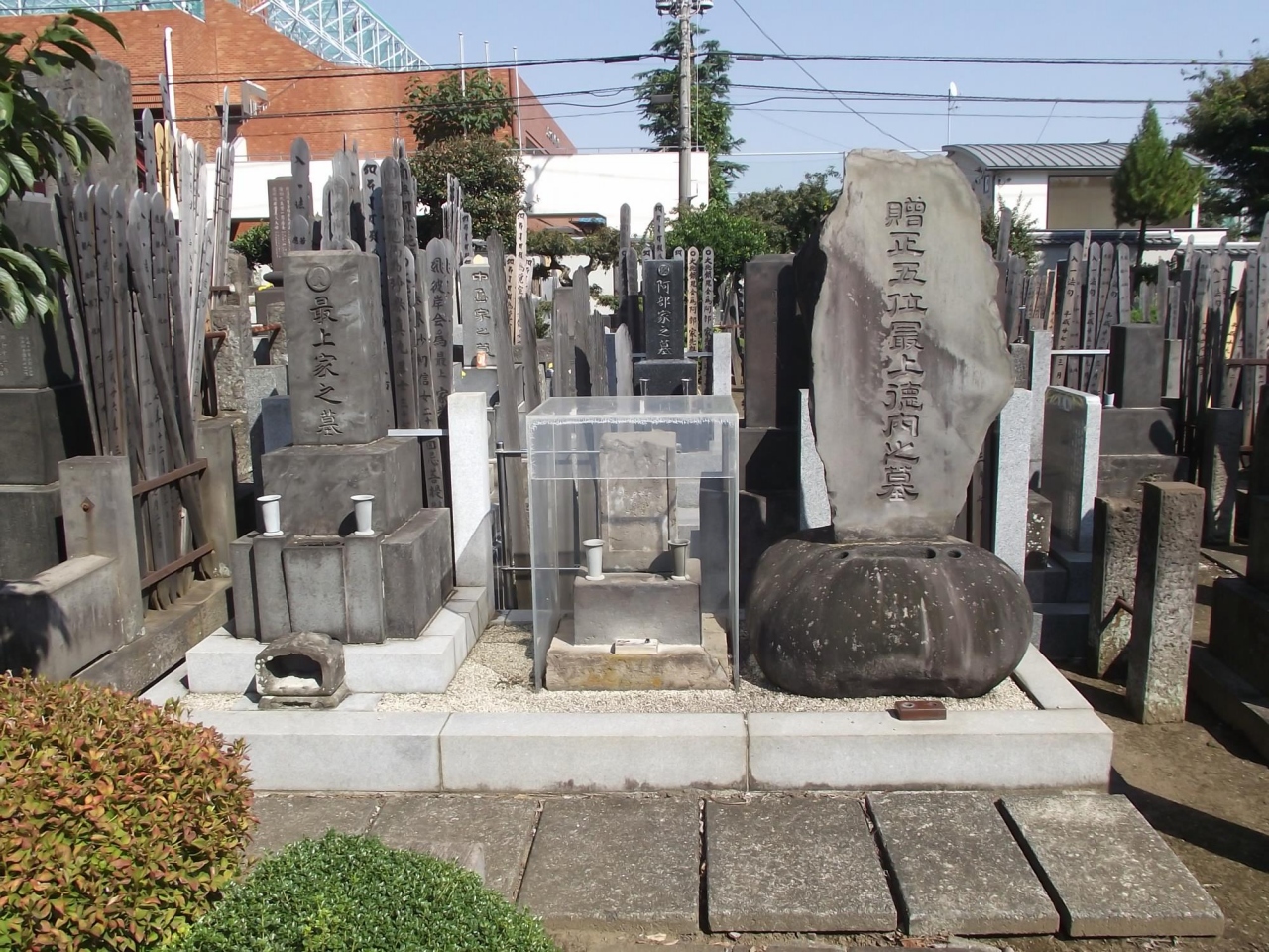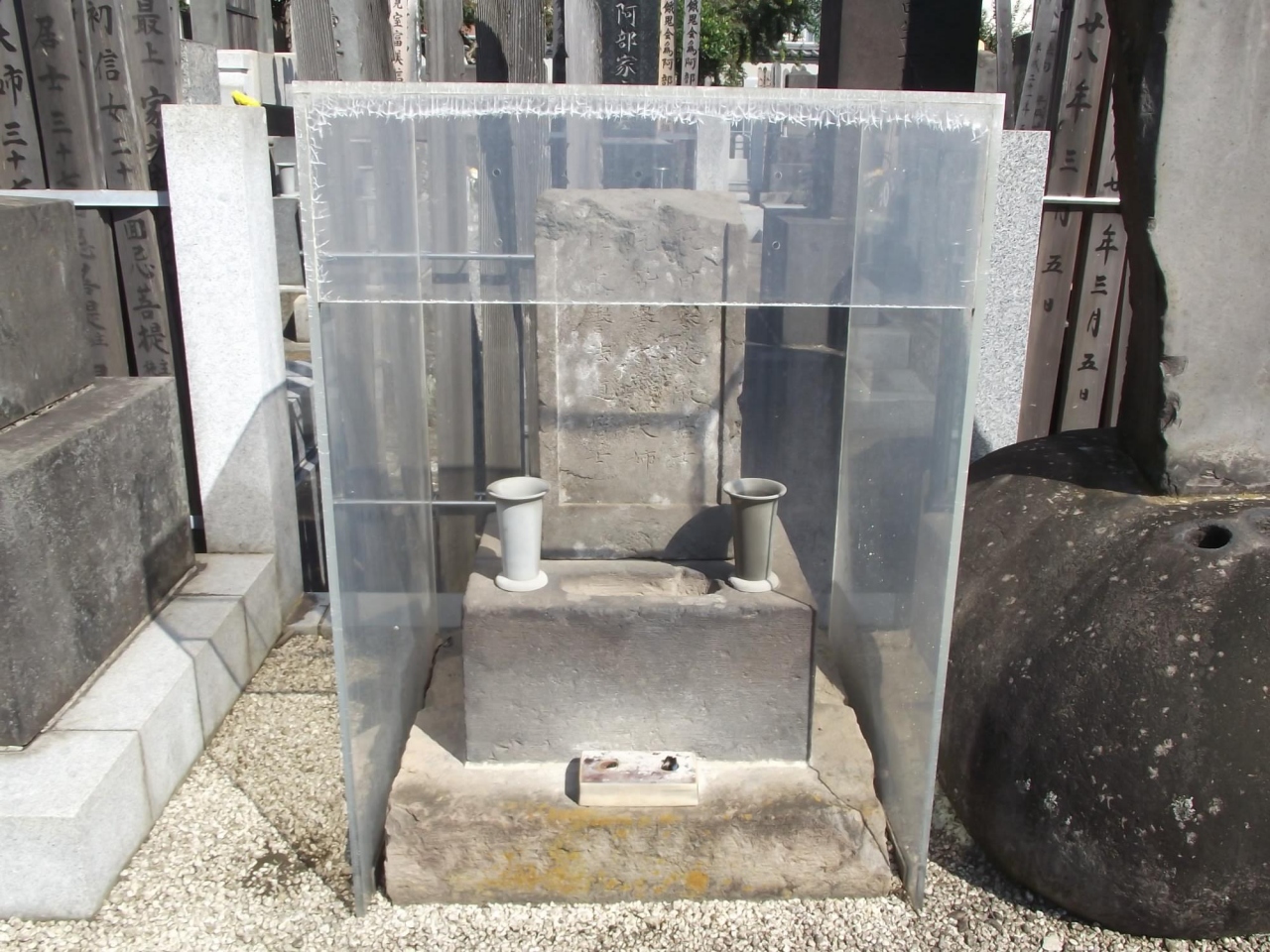 江戸末期の北方探検家・最上徳内墓は、大きな墓碑とともに透明ケースで覆われ大切にされていることが分かります。 また、最近改装などされたようで土留台や化粧砂などが新しくなっています。