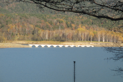 タウシュベツ川橋梁は幻の橋と云われます。これは糠平湖が人造湖であるため、季節により水位が大きく変動し、梁全体が水没してしまう時期もあれば、逆に橋梁全体が見渡せる時期もあるからです。国鉄士幌線として、建設は1937年で1955年まで使用されたとのことですから、約80年前のものですが、意外と崩れずにしっかりと残っているものです。