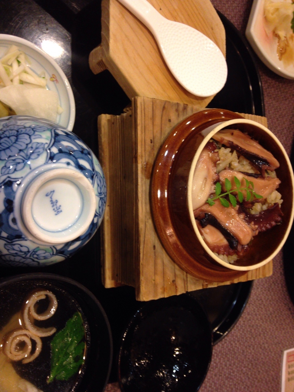 たこめしを食べに行きました。本当は本店のふく仙に行く予定だったが、定休日ということでこちらの店にいきました。駅のレストラン街に入っています。ランチ時で多くのサラリーマンで賑わっていました。単品でたこめしを注文。もっとたこが柔らかいと思ってましたが、、