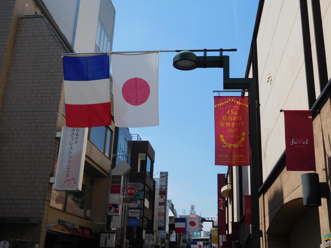 自由が丘駅南口を出てすぐの通りが「マリクレール通り」になります。自由が丘らしいおしゃれなネーミングの通りで、休日は結構人通りが多くなります。ちょうど、自由が丘女神祭りと共催の「秋のマリクレールフェスティバル」近くだったので、日本とフランスの国旗が掲げられ、いつもと違った雰囲気になっていました。