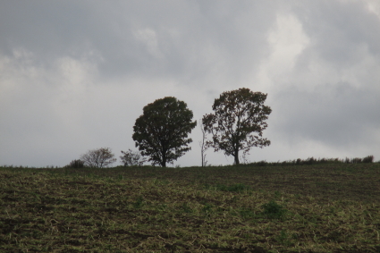 遠くの丘の上に小さく見えます。左の大きな木は葉を茂らせていますからお母さん?、右側の葉をだいぶ落としている木がお父さん?なのでしょうか。真ん中にある小さな木が子供です。この子供の木は、一時は台風で倒れてしまったそうですが、現在は復活されています。観光資源ですから維持も大変ですね。