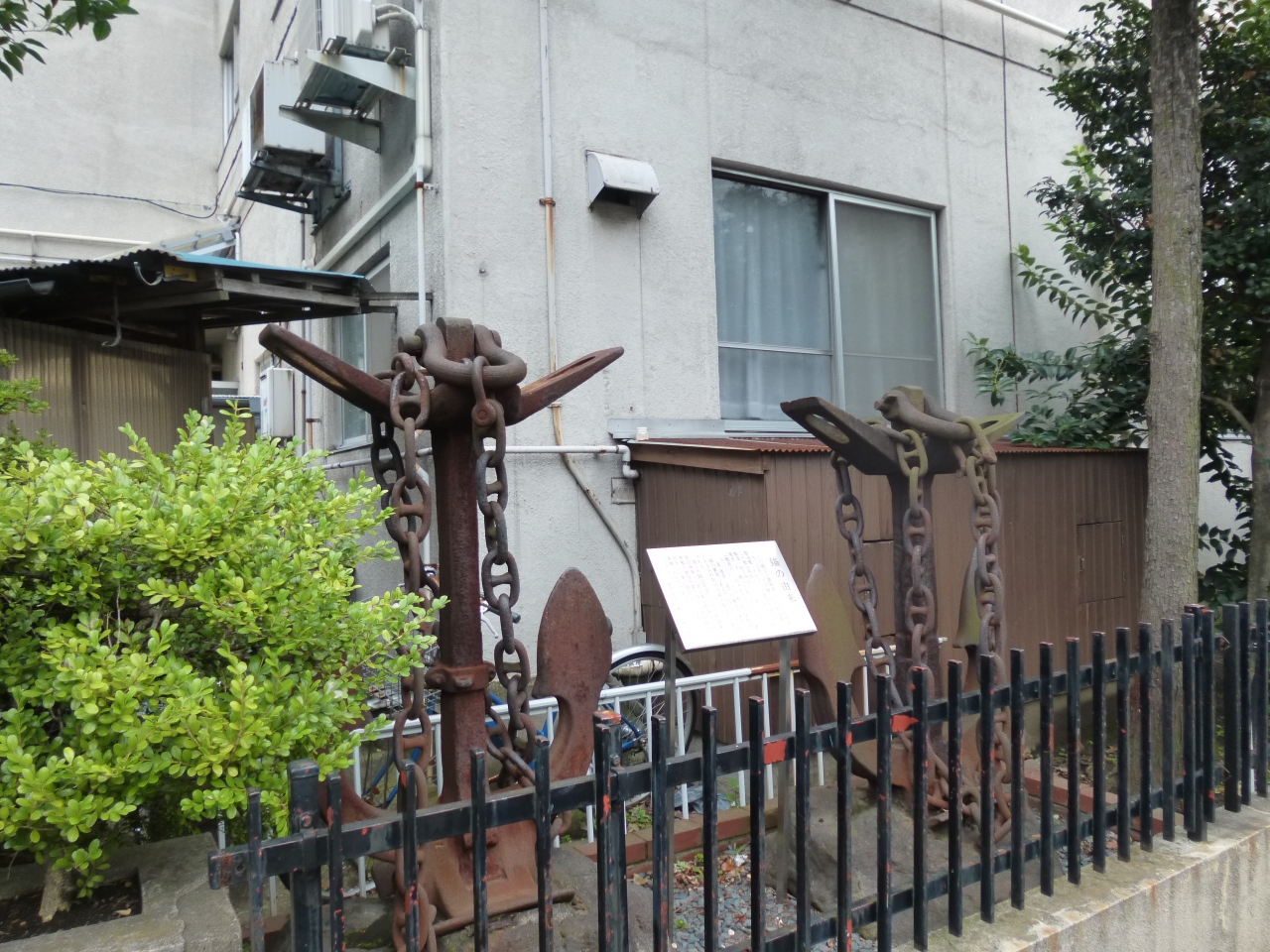 両国小学校、北西の角、芥川龍之介の文学碑の隣に、錨が二本並べられています。両国の小学校に何故、錨がと思いました。両国が特別関係したわけでは無く、解体をした両国の業者が手に入れて、寄付したそうです。どちらにしても、日露戦争で実際に使われた船の錨であるということで、誰でもが、間近に見れるのは、有難いことです。
