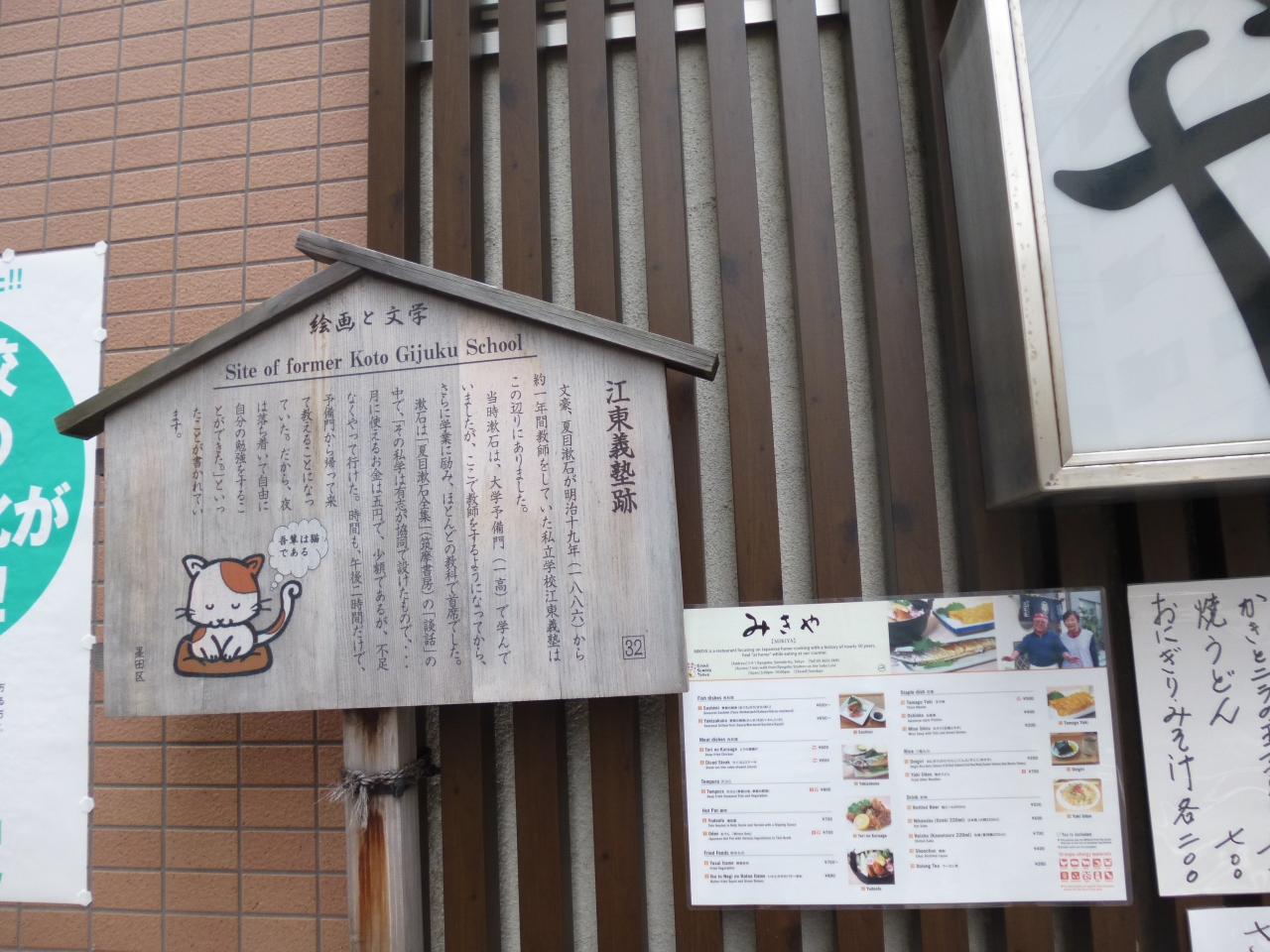 吉良邸跡、本所松坂町公園の南西側にあります。少し わかりにくい場所です。吉良邸裏門跡を訪ねた後、少し南へ歩くと、みきやという定食屋さんの壁際に高札があります。それによると、この辺りに私塾があり、夏目漱石が大学予備門(一高)で学びながら、ここで英語を教えていた事が、書かれていました。今でいう、アルバイトのようです。