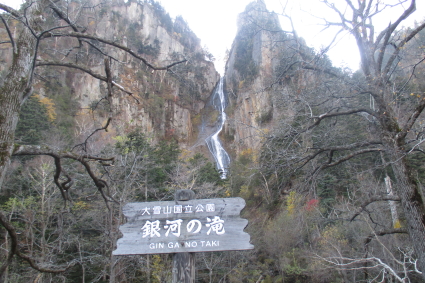 大雪国道(国道39号)を層雲峡温泉から石北峠方向へ2kmくらい進んだところにある「銀河トンネル(3,388m)」の手前から右の側道を進むと不動岩の岸壁を挟んで右に流星の滝、左に銀河の滝と並んであります。奥側となる銀河の滝は流星の滝に比べ一段と高さがあります。途中でワンクッションを置いて、岩肌を流れ下っています。別名は流星の男滝に比し、女滝と呼ばれます。柔らかい感じがするからでしょう。