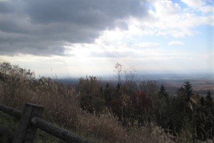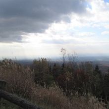 鹿追の方から然別湖畔温泉に通じているのは道道85号線です。余談ですが、この道路の愛称は、どこから名付けたのかパールスカイラインです。なお、この道路の然別と糠平間は2017年現在土砂崩れのため通行止めでした。それはさておき、然別湖畔温泉に向かって高度を上げていくと扇ヶ原展望台があります。駐車場は広いです。条件が整えば、かなりの見晴らしの様ですが、もやっていたのか遠くは霞んでいます。案内図によれは、足下からは十勝平野が広がり、その奥には日高山脈が見えるそうです。