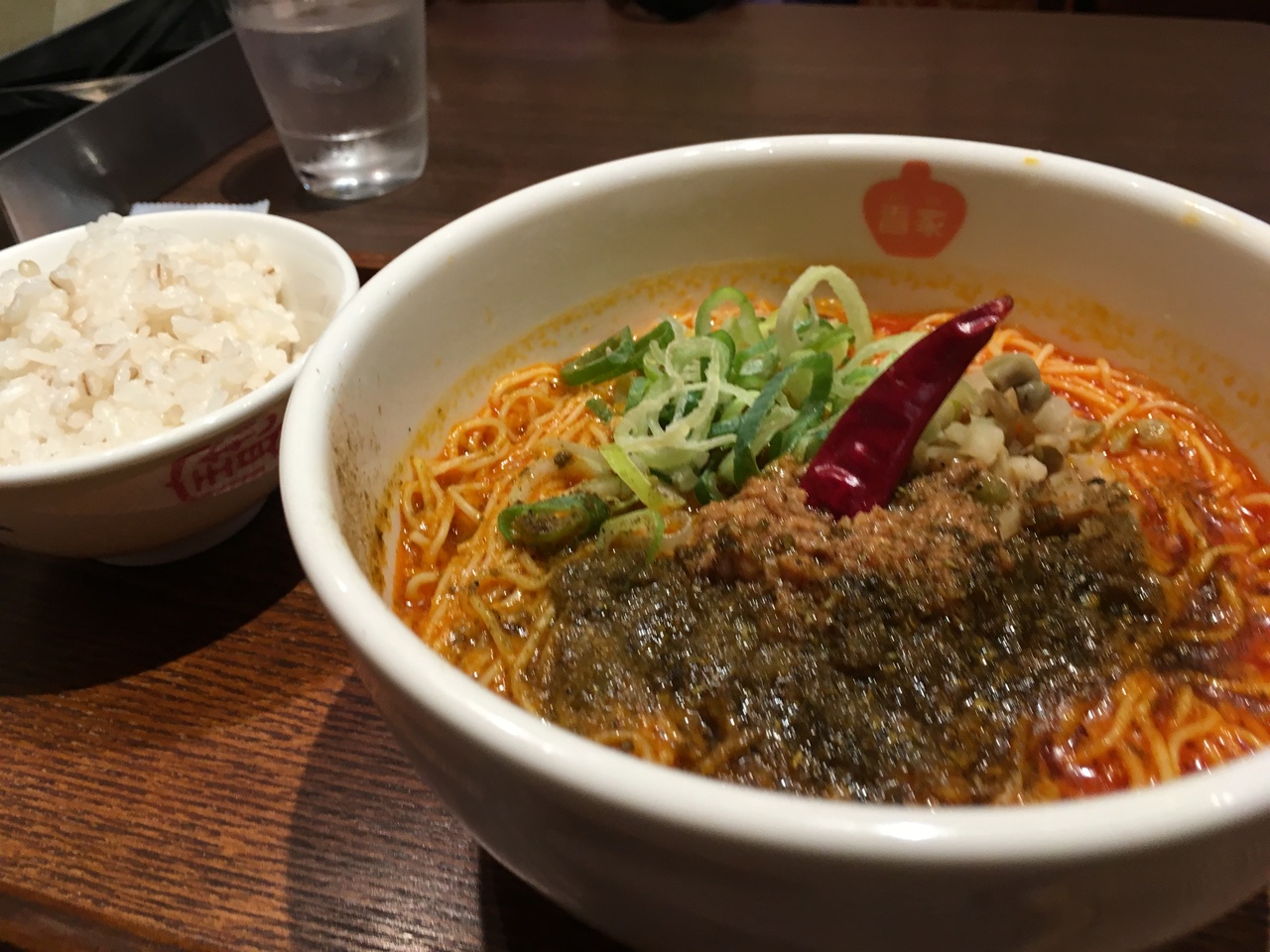 爽やかな香りの青花椒との説明書きに興味を持ち、青鬼・坦々麺を注文。半ライスが無料で付くとのことなので、勿論付けてもらう。