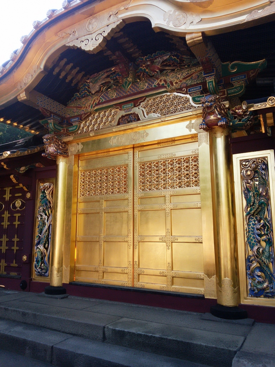 上野東照宮の参道を歩いていくと、正面に一際目立つのが唐門です。正式名称は、「唐破風造り四脚門」と言うようですが、黄金に装飾されたゴージャスな唐門は、徳川家康の権力と繁栄の象徴といった感じがあり、とても印象的でした。また、唐門の上部の錦鶏鳥・銀鶏鳥の透彫は精巧でとてもキレイなもので見応えもありました。ちなみに、唐門は無料で見学することができます。