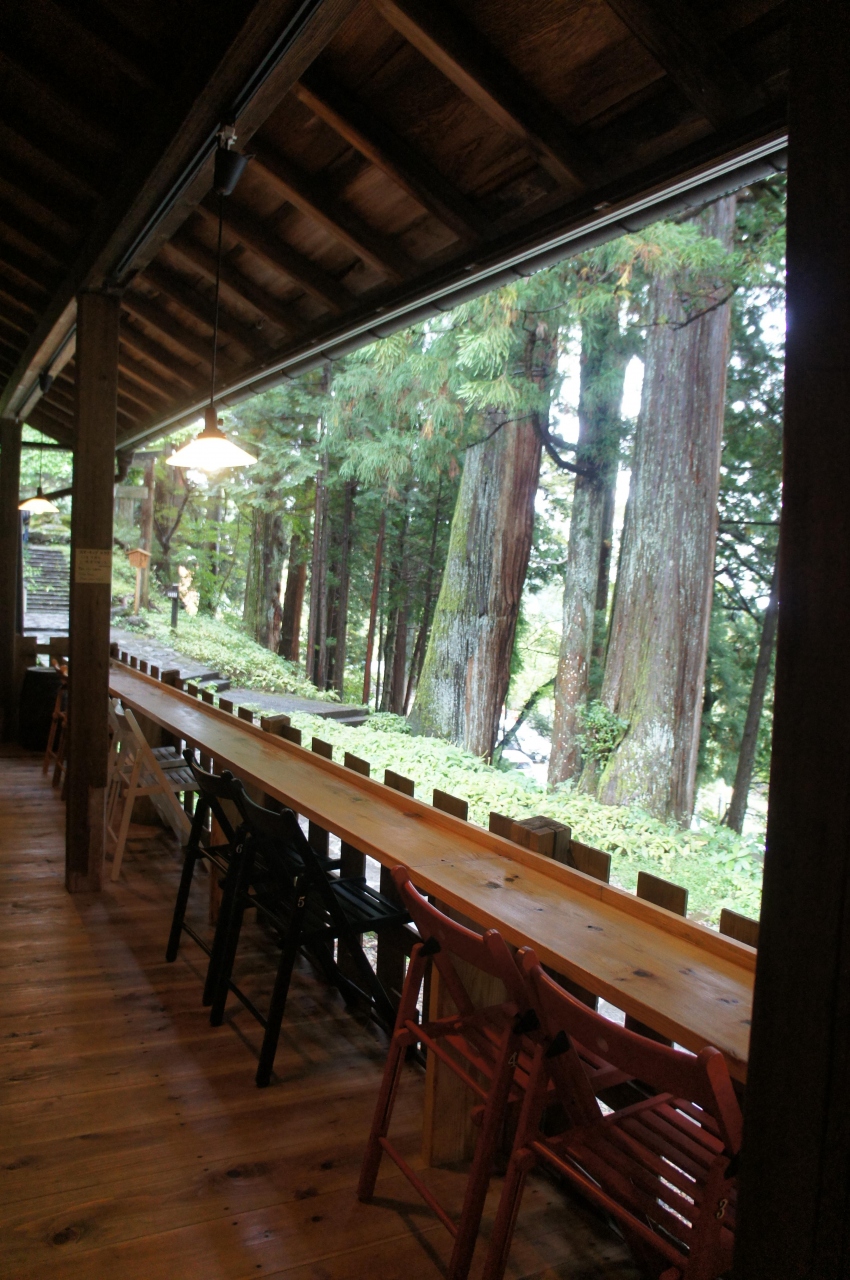 素敵な外観です。築300年の古民家を改装し、壁の一部は神橋と同じ朱色。テラス席に憧れて来ましたが、曇り空の肌寒い日で誰も座っていないため、中の席へ。
