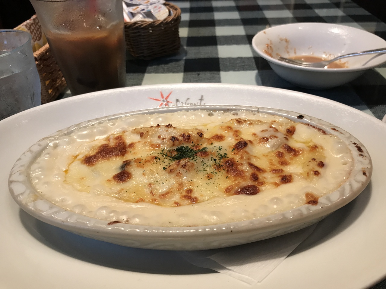 イルキャンティのランチへ。グラタンランチは本日はサーモンとシメジでした。サラダにスープとドリンクで950円ですが、追加310円ですがガーリックトーストも頼みました。グラタンはアッツアツでソースも濃厚です。