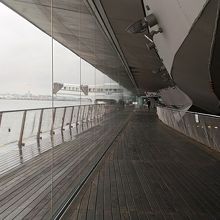日本大通り駅からが一番近いです。大きな船が止まっていなければ、遠くからみると何だろうと思われる構造ですが、景観に配慮してあまり高い建物にはしていないそうです。一方で、長さは相当で、陸地から屋上デッキの最先端までは急ぎ足でも5分以上かかりましたが、その分先端からの埠頭全体や港の眺めはすごくよかったです。