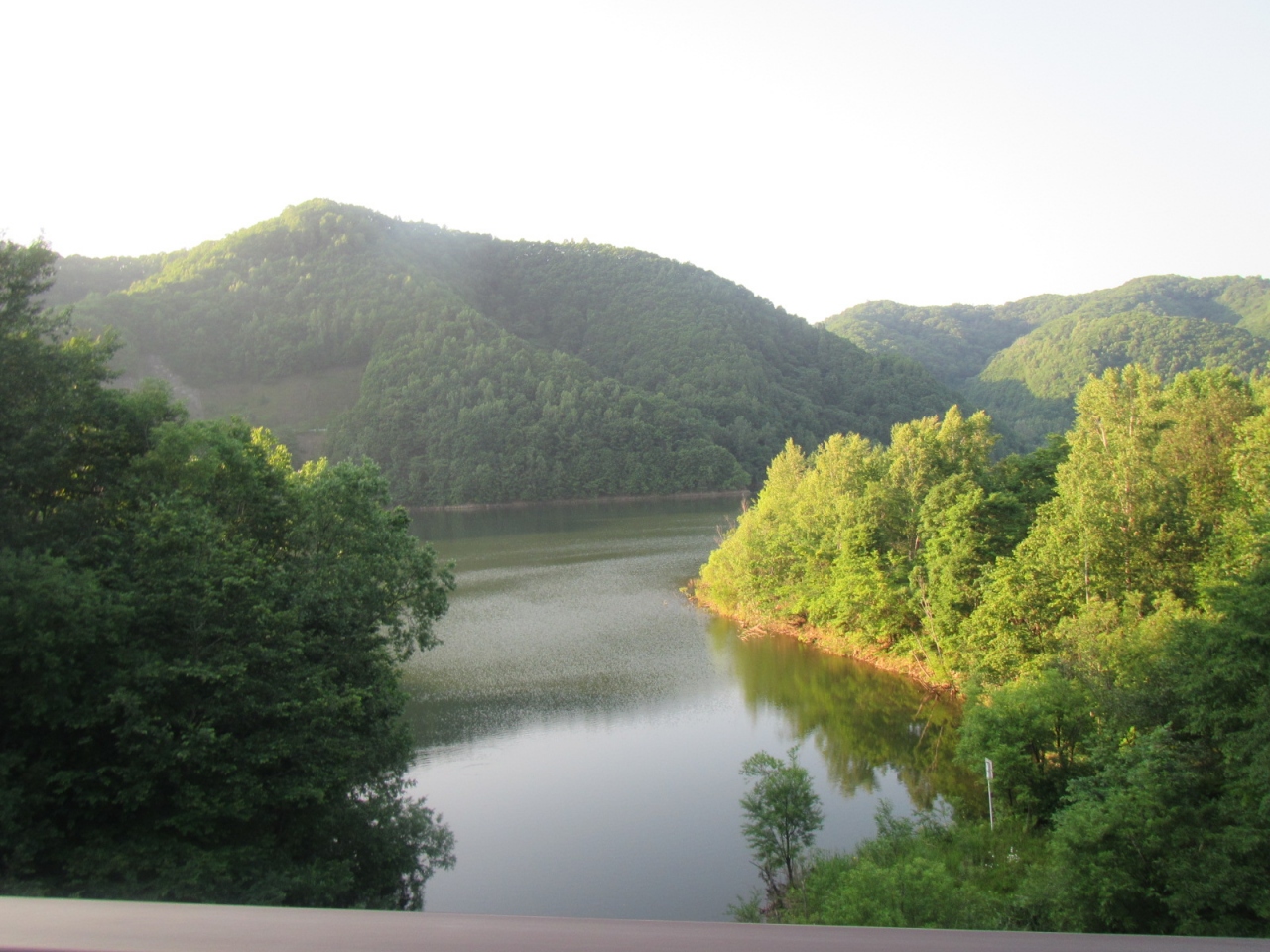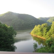 道道を行くと、ダムと管理事務所が見えますが、湖は夏場は沿道の木々が生い茂り、あまりよく見えません。