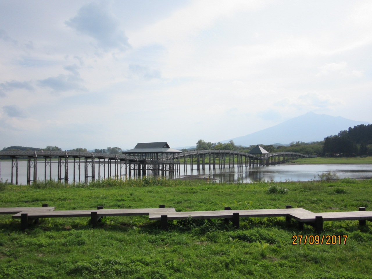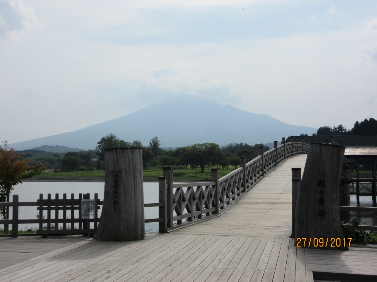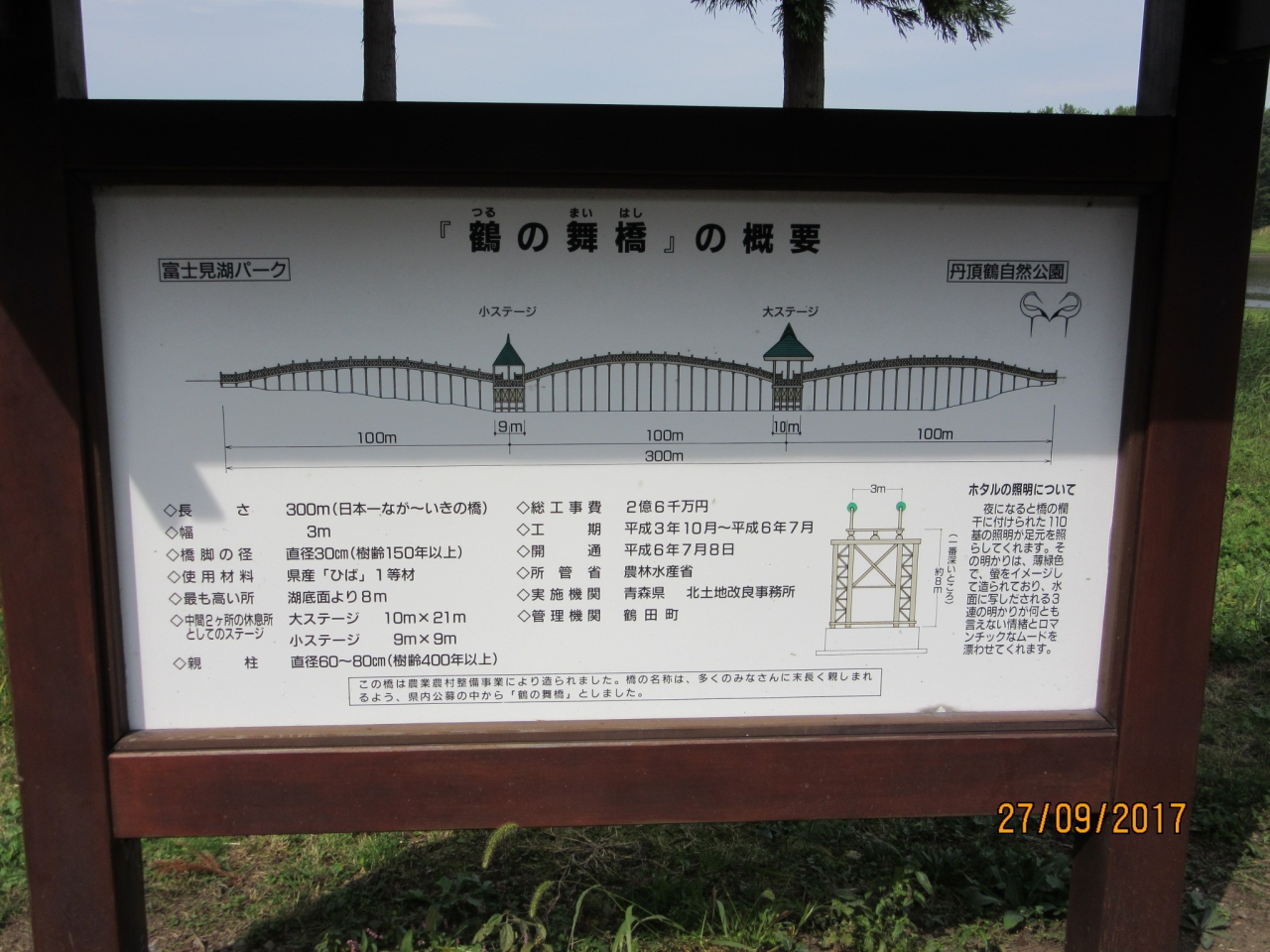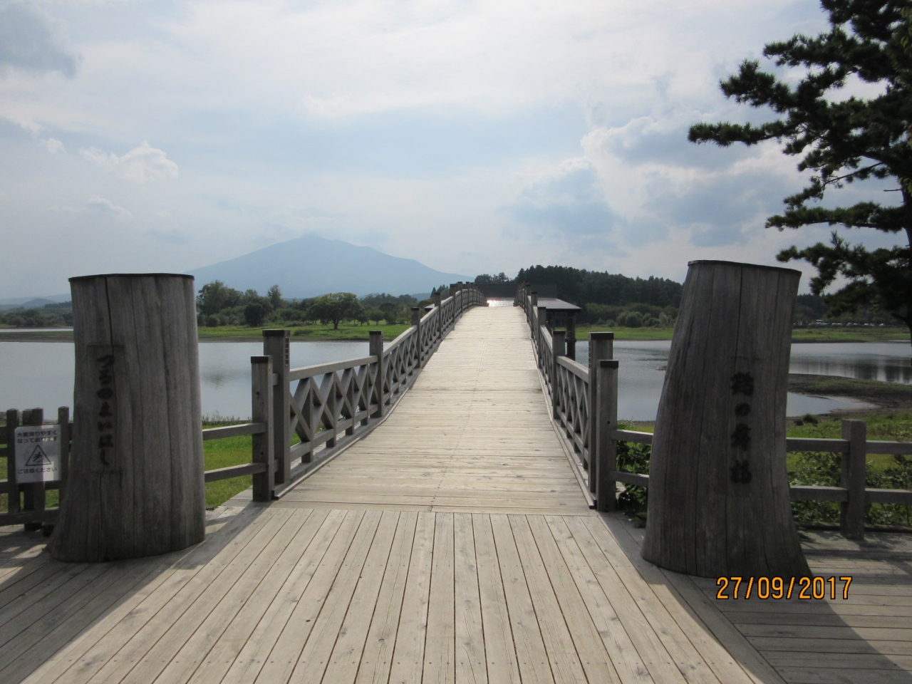 地元青森のヒバの木材を使用、木造の三連太鼓橋としては全長300メートルで日本で最も長いとの事。岩木山をバックに実に美しい橋であった。橋を渡りぐるっと1周するときに真横から見るとまさに【鶴が翼を広げた】ように見えた。【富士見湖】で実際に鶴が遊んでいた。一度は見たい絶景だが、アクセスの悪いのが唯一の難点であった。