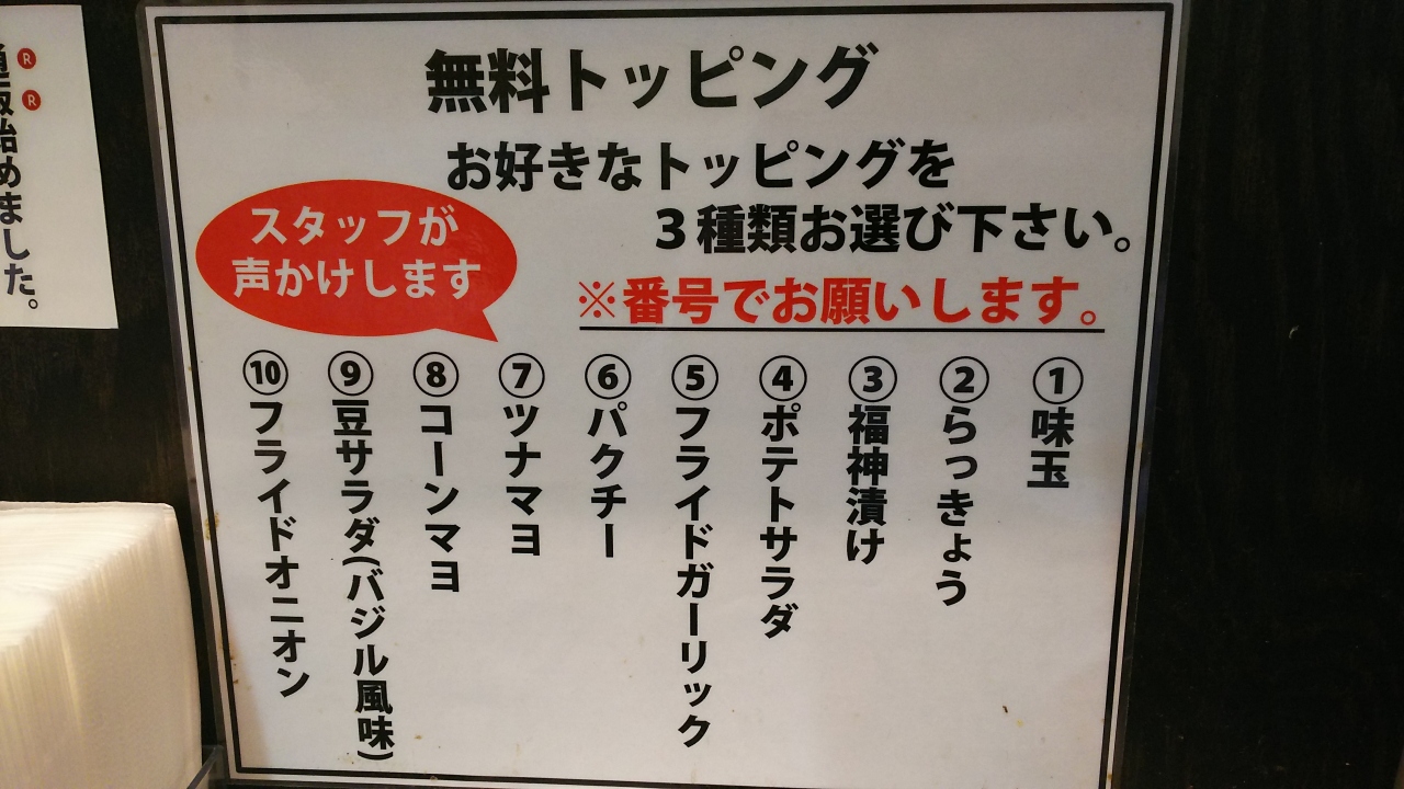 トッピングは10種類で無料で3種類を選べます。カレーが出てくる直前に店員さんに希望を聞かれるので、3種類を選んで、番号で答えるというシステムです。